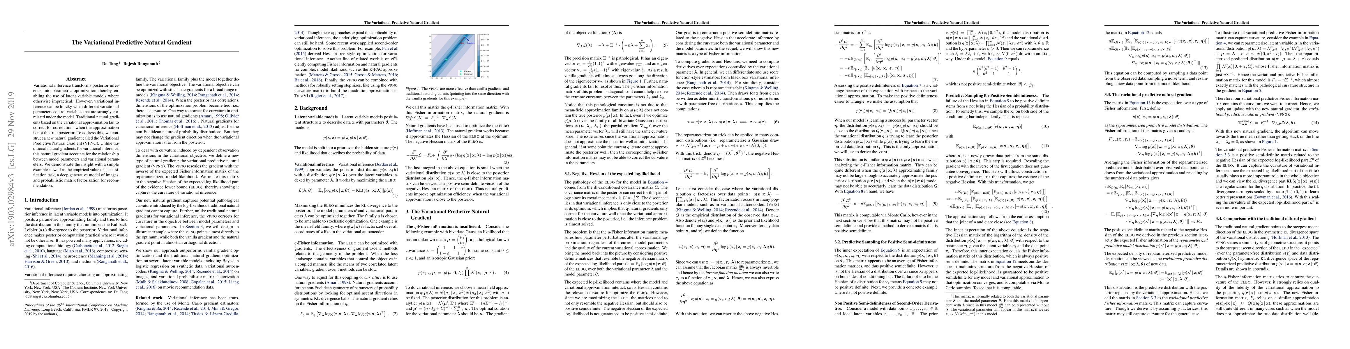 The Variational Predictive Natural Gradient (VPNG) addresses the limitations of traditional natural gradients in variational inference by accounting for correlations between model and variational parameters. Empirical results show its effectiveness in classification, deep generative models, and recommendation systems.