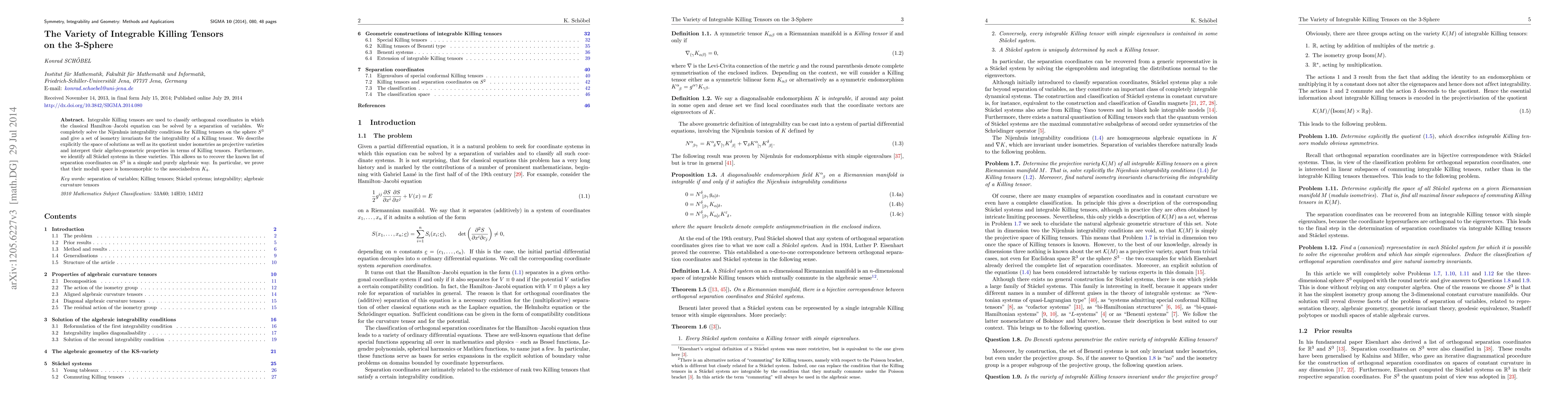 This paper classifies integrable Killing tensors on the 3-sphere $S^3$ and solves the Nijenhuis integrability conditions, providing a set of invariants. It identifies all St\"ackel systems and shows that the moduli space of separation coordinates is homeomorphic to the associahedron $K_4$.