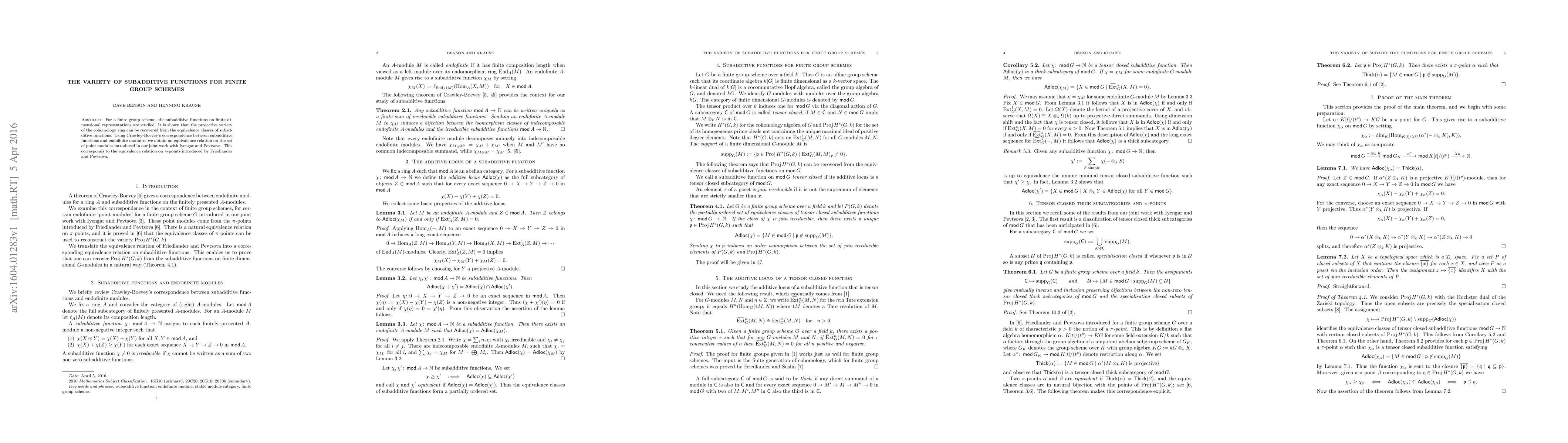 Researchers explore subadditive functions on finite group schemes, revealing a connection between these functions and endofinite modules that recovers the cohomology ring's projective variety. This discovery provides an equivalence relation on point modules, aligning with existing work by Friedlander and Pevtsova.