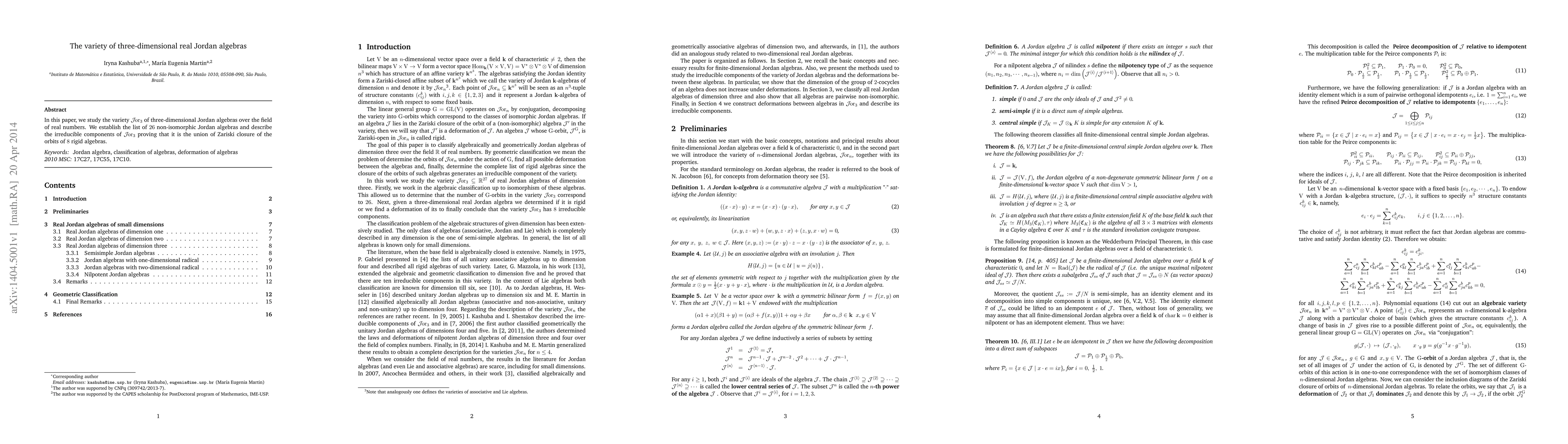 This paper identifies and lists 26 non-isomorphic three-dimensional Jordan algebras over real numbers, proving that the variety Jor_3 is the union of Zariski closures of orbits of 8 rigid algebras, thereby providing a comprehensive description of its irreducible components.