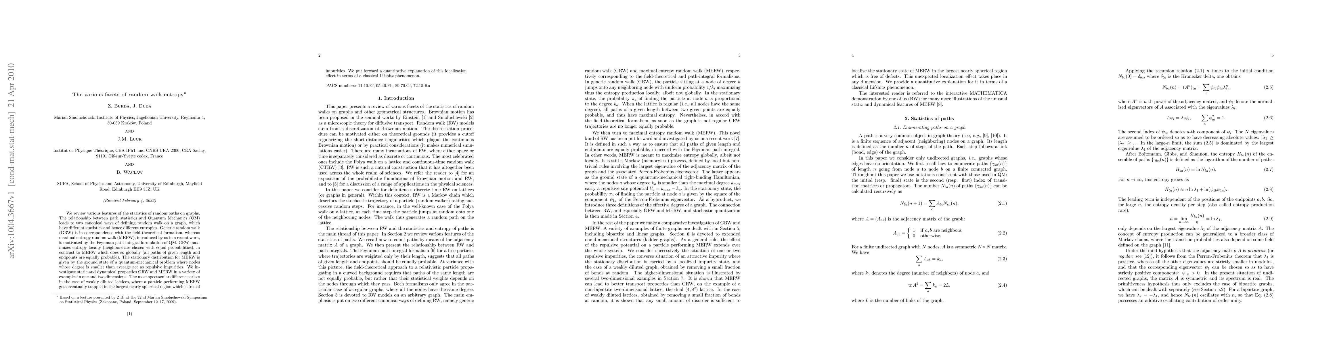 We review various features of the statistics of random paths on graphs. The relationship between path statistics and Quantum Mechanics (QM) leads to two canonical ways of defining random walk on a graph, which have different statistics and hence different entropies. Generic random walk (GRW) is in correspondence with the field-theoretical formalism, whereas maximal entropy random walk (MERW), introduced by us in a recent work, is motivated by the Feynman path-integral formulation of QM. GRW maximizes entropy locally (neighbors are chosen with equal probabilities), in contrast to MERW which does so globally (all paths of given length and endpoints are equally probable). The stationary distribution for MERW is given by the ground state of a quantum-mechanical problem where nodes whose degree is smaller than average act as repulsive impurities. We investigate static and dynamical properties GRW and MERW in a variety of examples in one and two dimensions. The most spectacular difference arises in the case of weakly diluted lattices, where a particle performing MERW gets eventually trapped in the largest nearly spherical region which is free of impurities. We put forward a quantitative explanation of this localization effect in terms of a classical Lifshitz phenomenon.