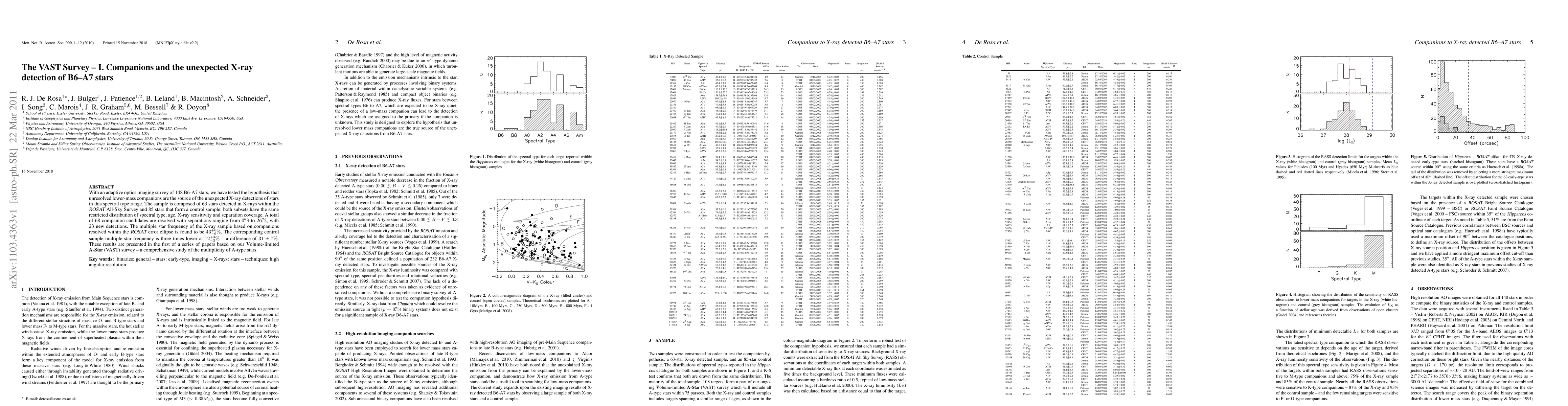 With an adaptive optics imaging survey of 148 B6-A7 stars, we have tested the hypothesis that unresolved lower-mass companions are the source of the unexpected X-ray detections of stars in this spectral type range. The sample is composed of 63 stars detected in X-rays within the ROSAT All-Sky Survey and 85 stars that form a control sample; both subsets have the same restricted distribution of spectral type, age, X-ray sensitivity and separation coverage. A total of 68 companion candidates are resolved with separations ranging from 0.3" to 26.2", with 23 new detections. The multiple star frequency of the X-ray sample based on companions resolved within the ROSAT error ellipse is found to be 43 (+6,-6)%. The corresponding control sample multiple star frequency is three times lower at 12 (+4,-3)% -- a difference of 31\pm7%. These results are presented in the first of a series of papers based on our Volume-limited A-Star (VAST) survey -- a comprehensive study of the multiplicity of A-type stars.