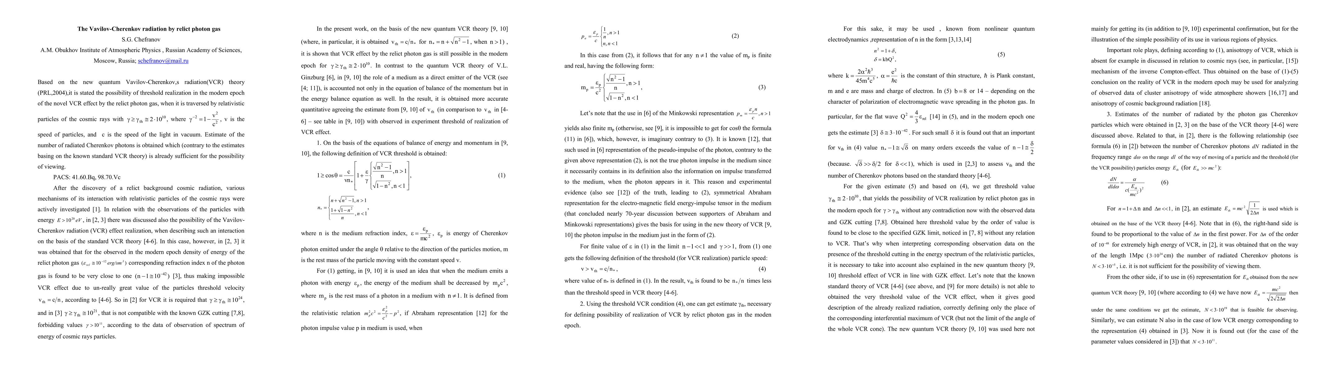 Based on the new quantum Vavilov-Cherenkov,s radiation(VCR) theory (PRL,2004),it is stated the possibility of threshold realization in the modern epoch of the novel VCR effect by the relict photon gas, when it is traversed by relativistic particles of the cosmic rays with \gamma \geq \gamma_th \cong 2 \cdot 10^10, where \gamma^2 = 1 - \frac{V^2}{C^2}, v is the speed of particles, and c is the speed of the light in vacuum.