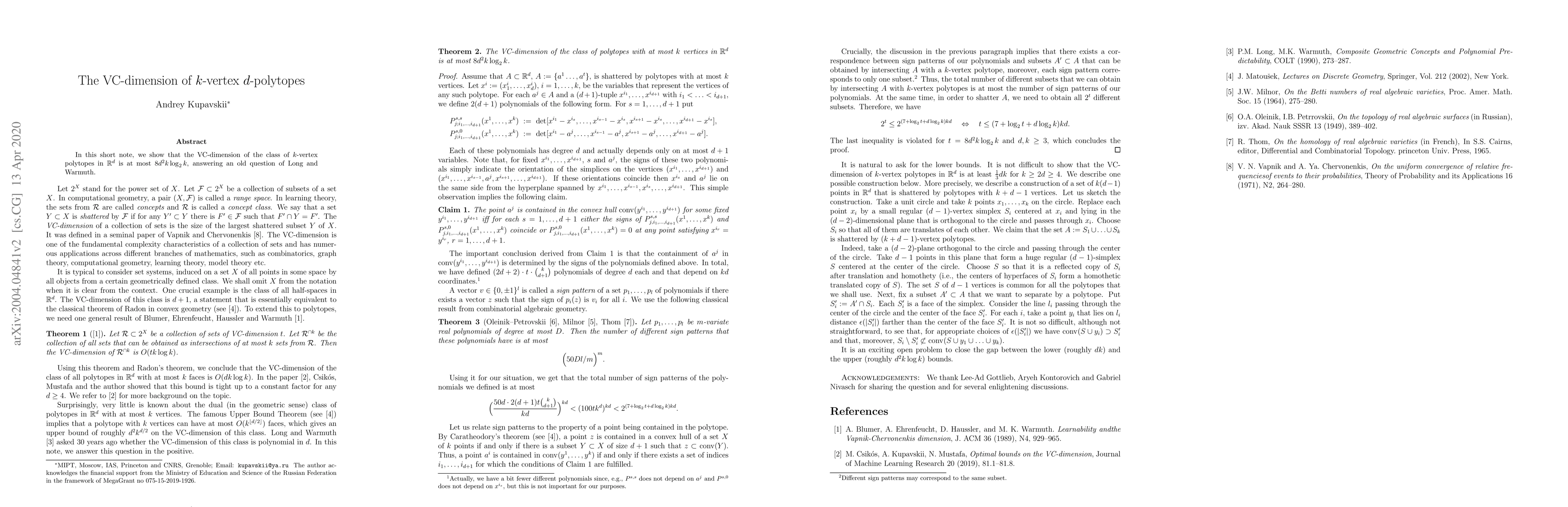 The VC-dimension of k-vertex polytopes in R^d is at most 8d^2k log_2k, solving an old question about the complexity of these geometric shapes.