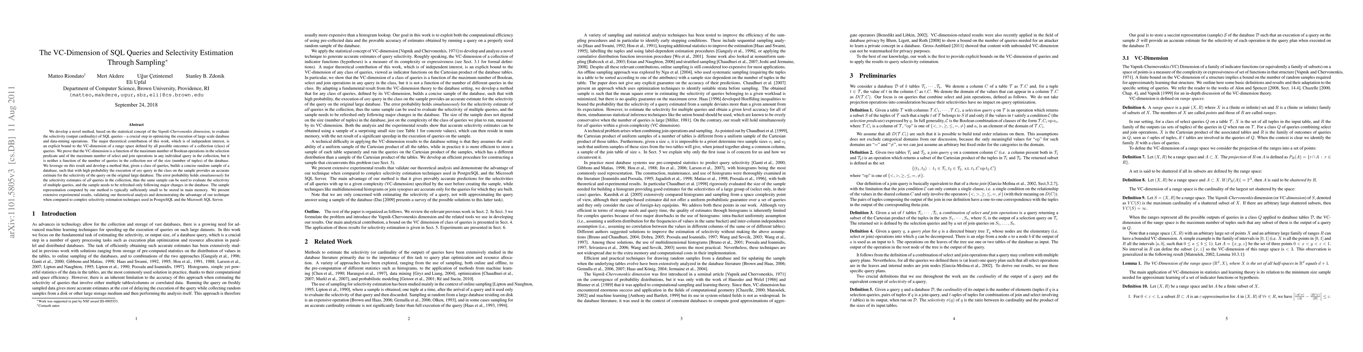 We develop a novel method, based on the statistical concept of the Vapnik-Chervonenkis dimension, to evaluate the selectivity (output cardinality) of SQL queries - a crucial step in optimizing the execution of large scale database and data-mining operations. The major theoretical contribution of this work, which is of independent interest, is an explicit bound to the VC-dimension of a range space defined by all possible outcomes of a collection (class) of queries. We prove that the VC-dimension is a function of the maximum number of Boolean operations in the selection predicate and of the maximum number of select and join operations in any individual query in the collection, but it is neither a function of the number of queries in the collection nor of the size (number of tuples) of the database. We leverage on this result and develop a method that, given a class of queries, builds a concise random sample of a database, such that with high probability the execution of any query in the class on the sample provides an accurate estimate for the selectivity of the query on the original large database. The error probability holds simultaneously for the selectivity estimates of all queries in the collection, thus the same sample can be used to evaluate the selectivity of multiple queries, and the sample needs to be refreshed only following major changes in the database. The sample representation computed by our method is typically sufficiently small to be stored in main memory. We present extensive experimental results, validating our theoretical analysis and demonstrating the advantage of our technique when compared to complex selectivity estimation techniques used in PostgreSQL and the Microsoft SQL Server.