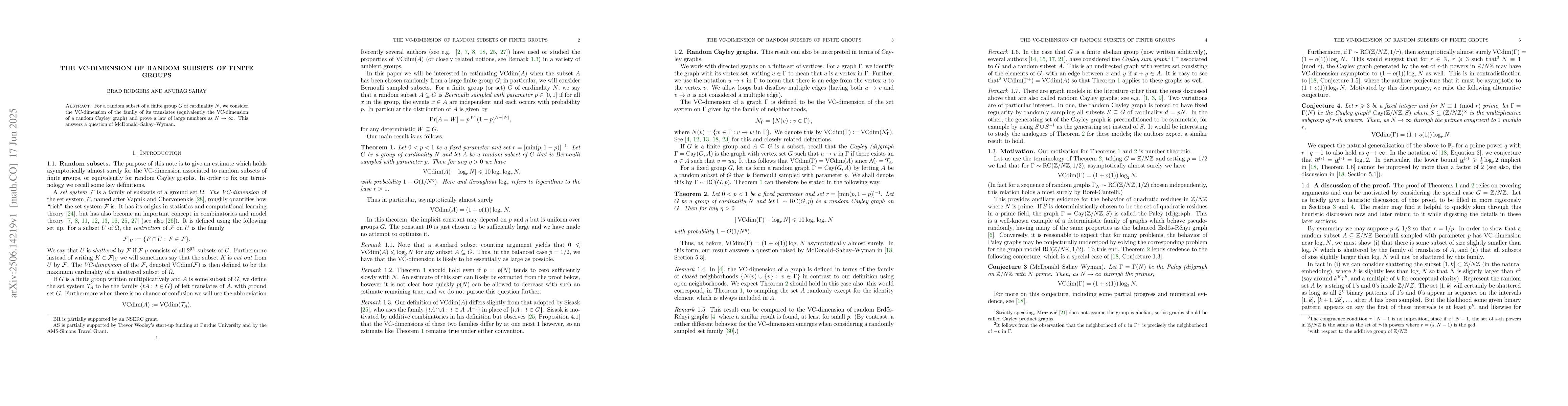 The paper analyzes the VC-dimension of random subsets of finite groups, proving a law of large numbers as N→∞ for the VC-dimension of the family of translates of a random subset of a finite group G with cardinality N, answering a question posed by McDonald, Sahay, and Wyman.