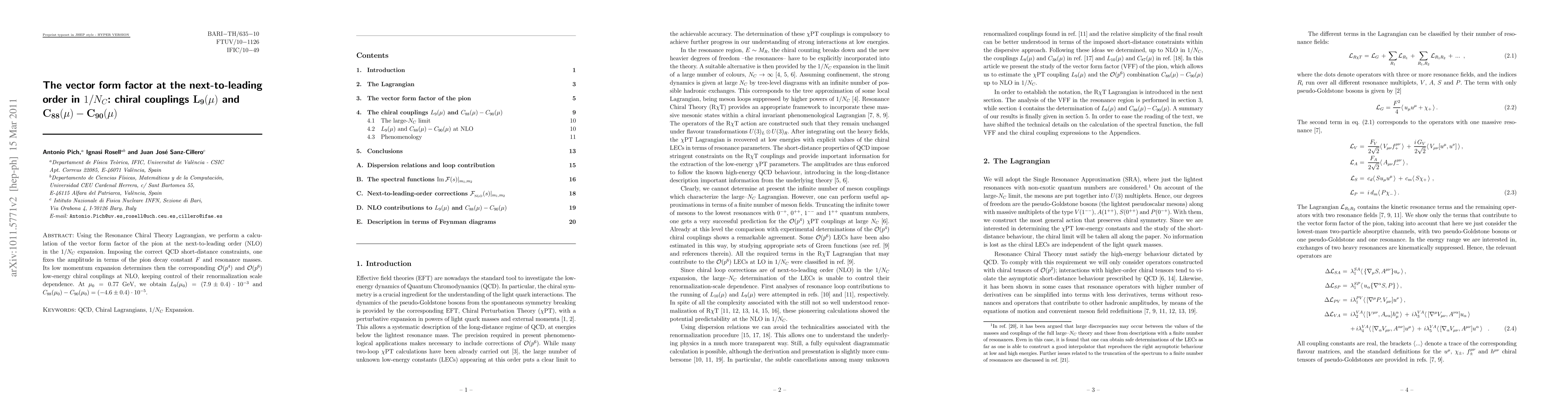 Using the Resonance Chiral Theory Lagrangian, we perform a calculation of the vector form factor of the pion at the next-to-leading order (NLO) in the 1/N(C) expansion. Imposing the correct QCD short-distance constraints, one fixes the amplitude in terms of the pion decay constant F and resonance masses. Its low momentum expansion determines then the corresponding O(p4) and O(p6) low-energy chiral couplings at NLO, keeping control of their renormalization scale dependence. At mu0=0.77 GeV, we obtain L9(mu0) = (7.9 \pm 0.4) 10^{-3} and C88(mu0)-C90(mu0)=(-4.6 \pm 0.4) 10^{-5}.