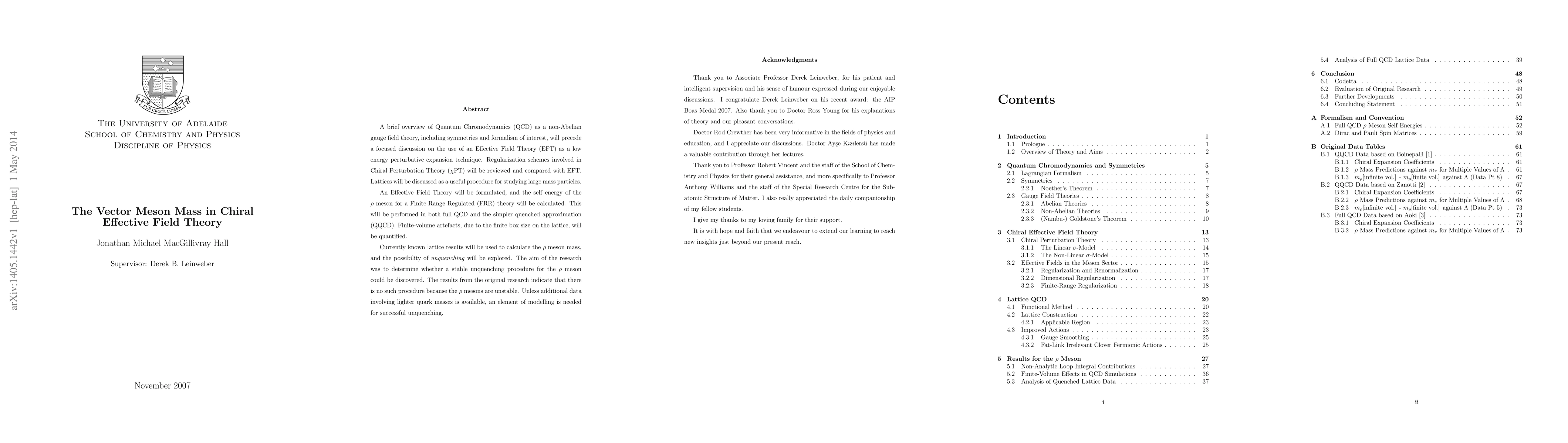 A brief overview of Quantum Chromodynamics (QCD) as a non-Abelian gauge field theory, including symmetries and formalism of interest, will precede a focused discussion on the use of an Effective Field Theory (EFT) as a low energy perturbative expansion technique. Regularization schemes involved in Chiral Perturbation Theory (\c{hi}PT) will be reviewed and compared with EFT. Lattices will be discussed as a useful procedure for studying large mass particles. An Effective Field Theory will be formulated, and the self energy of the \r{ho} meson for a Finite-Range Regulated (FRR) theory will be calculated. This will be performed in both full QCD and the simpler quenched approximation (QQCD). Finite-volume artefacts, due to the finite box size on the lattice, will be quantified. Currently known lattice results will be used to calculate the \r{ho} meson mass, and the possibility of unquenching will be explored. The aim of the research was to determine whether a stable unquenching procedure for the \r{ho} meson could be discovered. The results from the original research indicate that there is no such procedure because the \r{ho} mesons are unstable. Unless additional data involving lighter quark masses is available, an element of modelling is needed for successful unquenching.
