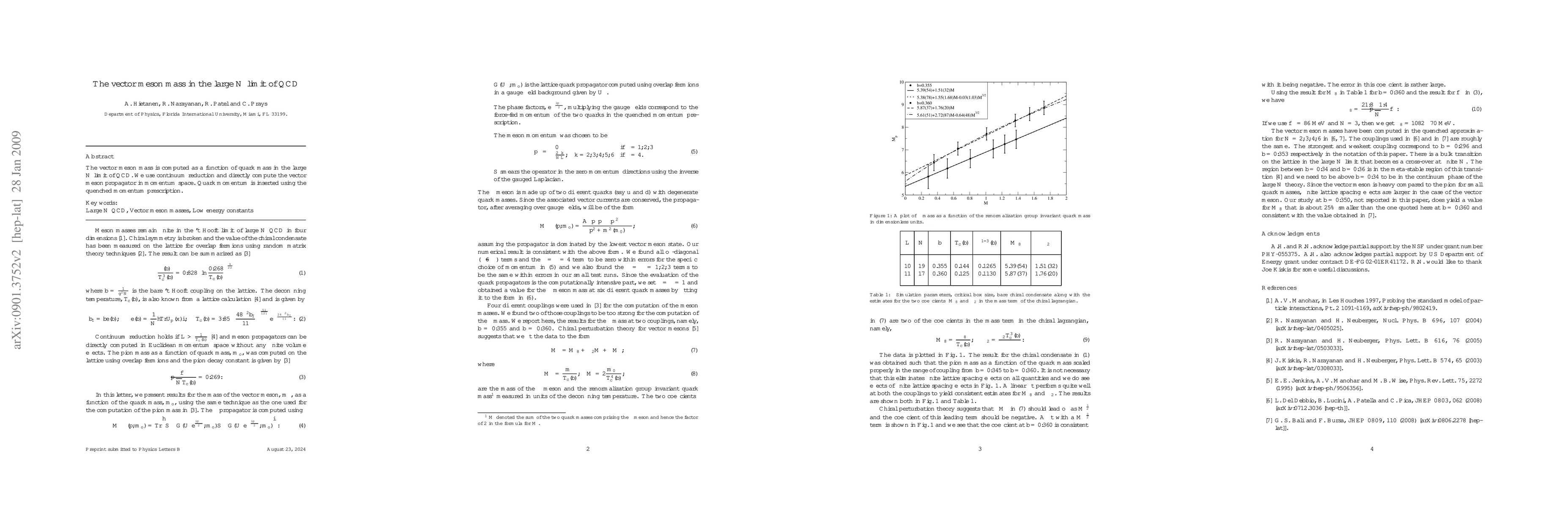 The vector meson mass is computed as a function of quark mass in the large N limit of QCD. We use continuum reduction and directly compute the vector meson propagator in momentum space. Quark momentum is inserted using the quenched momentum prescription.