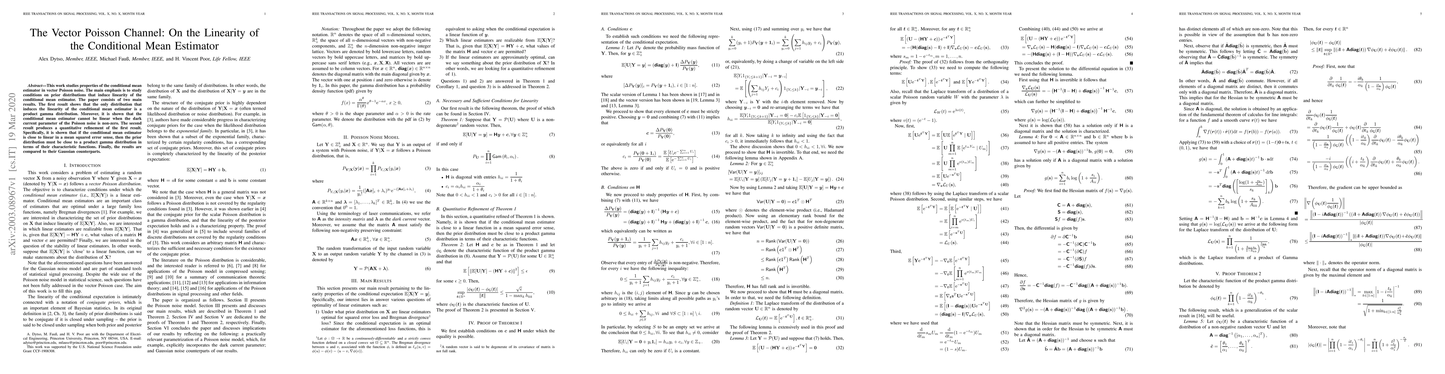 This paper investigates the conditional mean estimator in vector Poisson noise, revealing that linearity is only induced by a product gamma distribution. It also demonstrates that non-zero dark current parameters prevent linearity, and provides a quantitative refinement showing that near-linearity implies the prior distribution is close to a product gamma distribution in terms of characteristic functions.