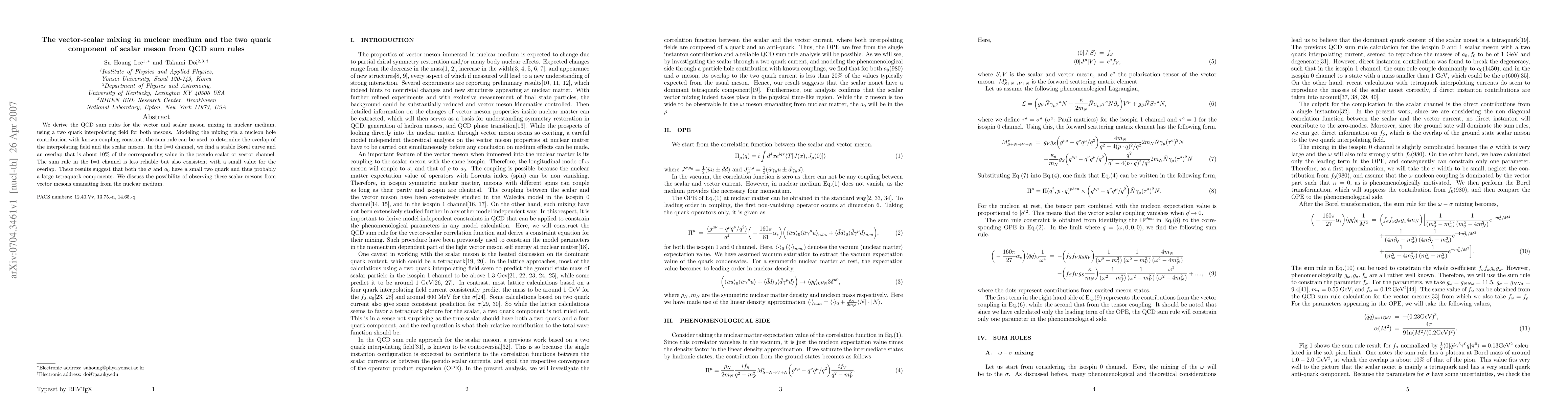 This paper derives QCD sum rules for the vector-scalar meson mixing in nuclear medium, finding a small overlap for the two-quark component in scalar mesons, suggesting significant tetraquark components. The results imply potential observation of these scalar mesons via vector mesons from nuclear medium.
