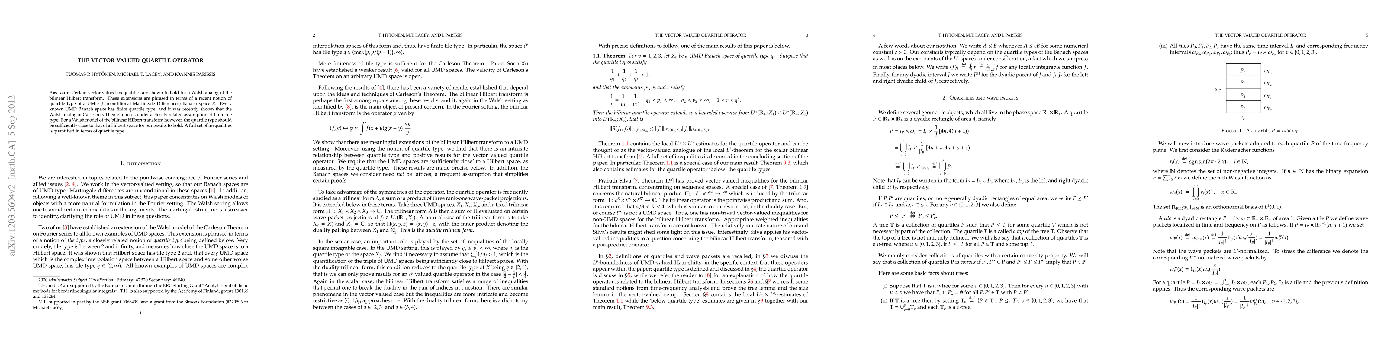 Certain vector-valued inequalities are shown to hold for a Walsh analog of the bilinear Hilbert transform. These extensions are phrased in terms of a recent notion of quartile type of a UMD (Unconditional Martingale Differences) Banach space X. Every known UMD Banach space has finite quartile type, and it was recently shown that the Walsh analog of Carleson's Theorem holds under a closely related assumption of finite tile type. For a Walsh model of the bilinear Hilbert transform however, the quartile type should be sufficiently close to that of a Hilbert space for our results to hold. A full set of inequalities is quantified in terms of quartile type.