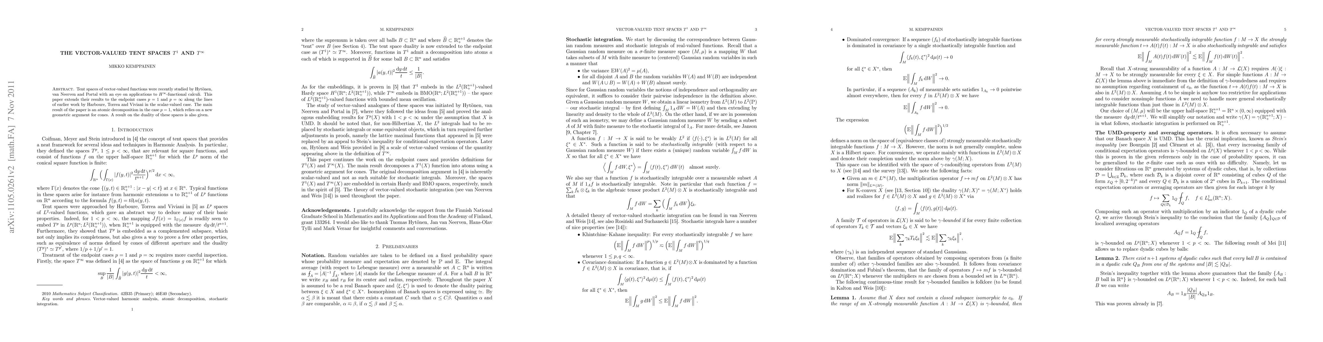 Tent spaces of vector-valued functions were recently studied by Hyt\"onen, van Neerven and Portal with an eye on applications to H^\infty-functional calculi. This paper extends their results to the endpoint cases p = 1 and p = \infty along the lines of earlier work by Harboure, Torrea and Viviani in the scalar-valued case. The main result of the paper is an atomic decomposition in the case p = 1, which relies on a new geometric argument for cones. A result on the duality of these spaces is also given.