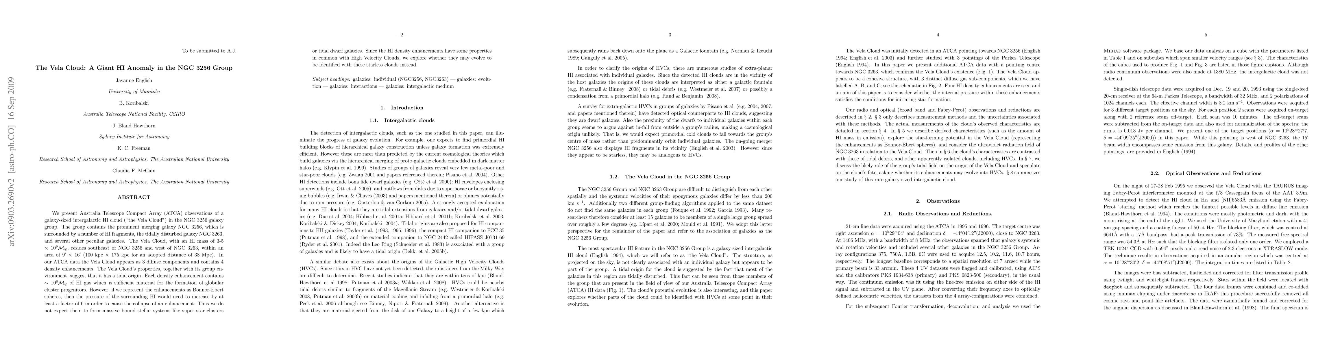 The Vela Cloud, a galaxy-sized HI cloud in the NGC 3256 group, consists of 3 diffuse components and 4 density enhancements, suggesting a tidal origin. While the cloud's density enhancements could form globular cluster progenitors, they are not expected to collapse into massive bound stellar systems due to insufficient surrounding pressure.