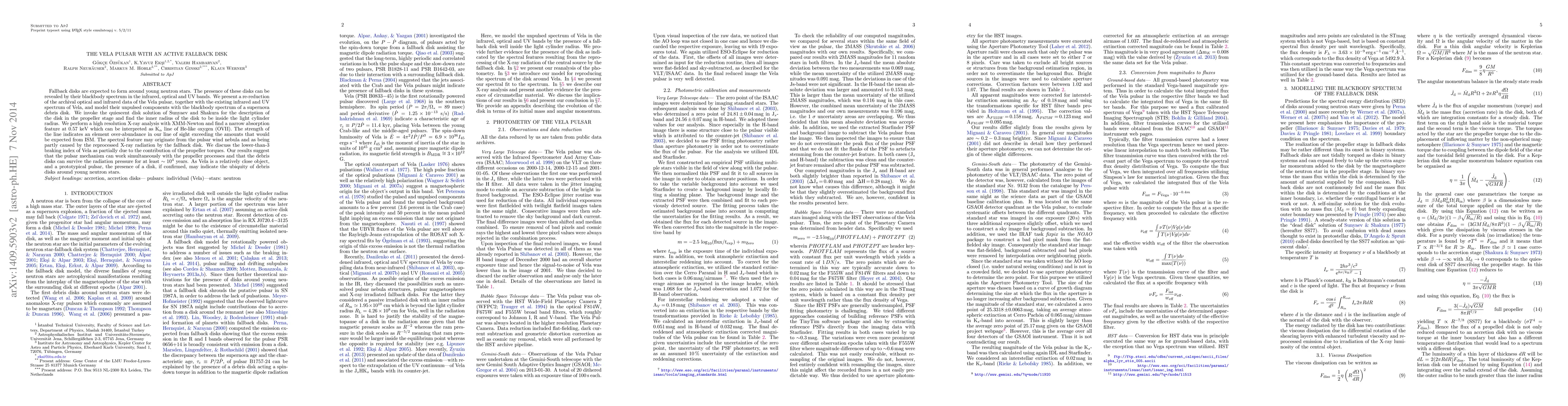This paper re-examines the Vela pulsar, revealing evidence of a fallback disk through its blackbody spectrum in optical and infrared bands. The study finds the disk's inner radius within the light cylinder, and identifies a narrow X-ray absorption feature likely due to He-like oxygen, suggesting an over-abundance in the line of sight. The findings imply that pulsar mechanisms and propeller processes can coexist, supporting the potential ubiquity of debris disks around young neutron stars.