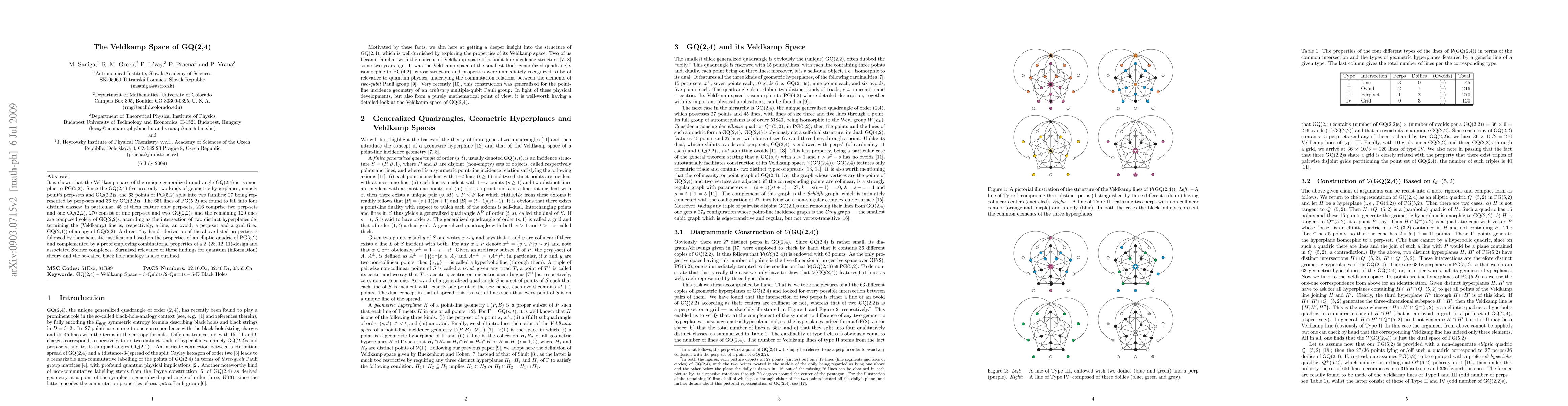 The Veldkamp space of the unique GQ(2,4) is isomorphic to PG(5,2), with its 63 points divided into two families and 651 lines categorized into four classes based on the intersections of hyperplanes. These findings have potential implications for quantum information theory and the black hole analogy.