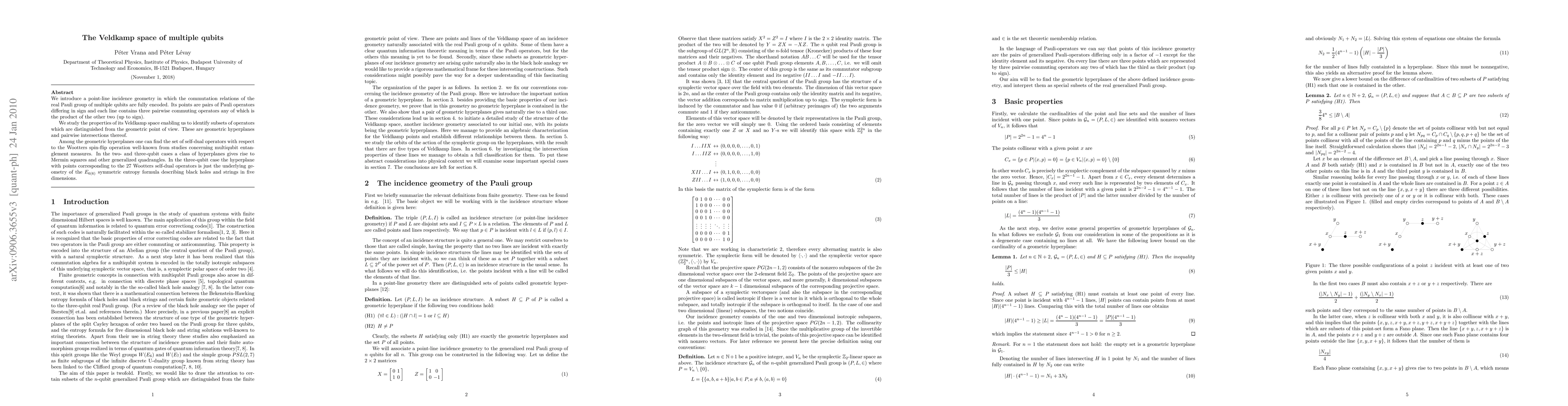 This paper introduces a Veldkamp space geometry encoding the commutation relations of multiple qubits' Pauli operators, identifying geometric hyperplanes and intersections that correspond to self-dual operators and structures like Mermin squares and E6(6) symmetric entropy formula in the three-qubit case.