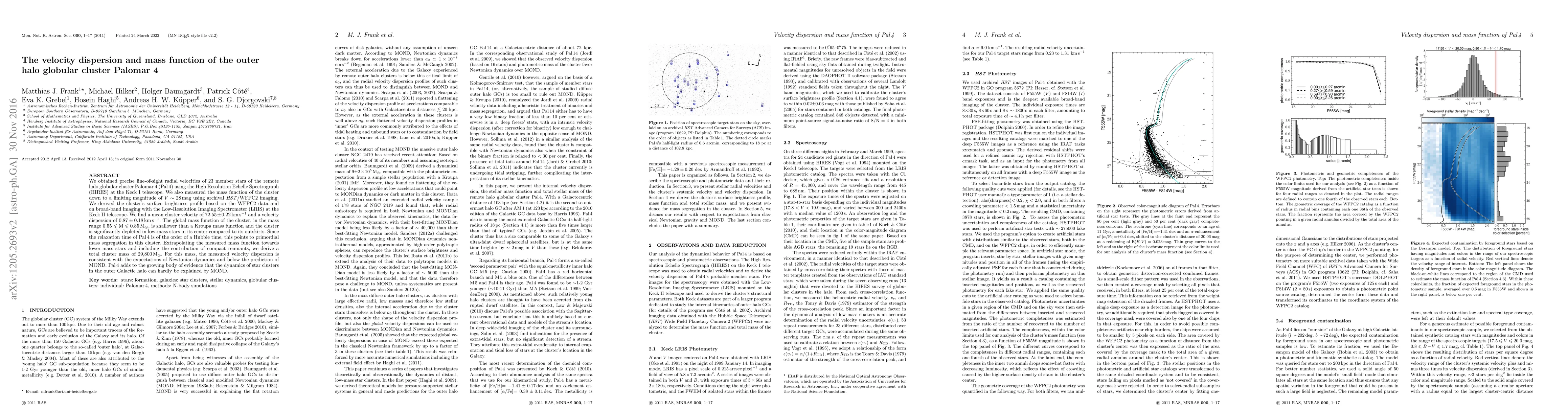 We obtained precise line-of-sight radial velocities of 23 member stars of the remote halo globular cluster Palomar 4 (Pal 4) using the High Resolution Echelle Spectrograph (HIRES) at the Keck I telescope. We also measured the mass function of the cluster down to a limiting magnitude of V~28 mag using archival HST/WFPC2 imaging. We derived the cluster's surface brightness profile based on the WFPC2 data and on broad-band imaging with the Low-Resolution Imaging Spectrometer (LRIS) at the Keck II telescope. We find a mean cluster velocity of 72.55+/-0.22 km/s and a velocity dispersion of 0.87+/-0.18 km/s. The global mass function of the cluster, in the mass range 0.55<=M<=0.85 M_solar, is shallower than a Kroupa mass function and the cluster is significantly depleted in low-mass stars in its center compared to its outskirts. Since the relaxation time of Pal 4 is of the order of a Hubble time, this points to primordial mass segregation in this cluster. Extrapolating the measured mass function towards lower-mass stars and including the contribution of compact remnants, we derive a total cluster mass of 29800 M_solar. For this mass, the measured velocity dispersion is consistent with the expectations of Newtonian dynamics and below the prediction of Modified Newtonian Dynamics (MOND). Pal 4 adds to the growing body of evidence that the dynamics of star clusters in the outer Galactic halo can hardly be explained by MOND.