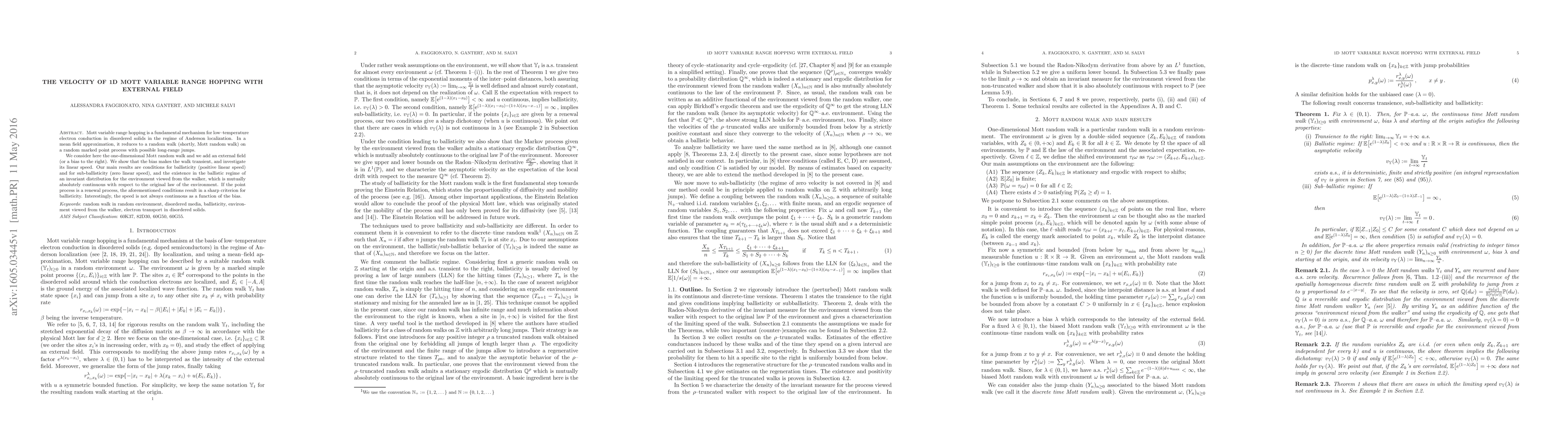 Mott variable range hopping is a fundamental mechanism for low-temperature electron conduction in disordered solids in the regime of Anderson localization. In a mean field approximation, it reduces to a random walk (shortly, Mott random walk) on a random marked point process with possible long-range jumps. We consider here the one-dimensional Mott random walk and we add an external field (or a bias to the right). We show that the bias makes the walk transient, and investigate its linear speed. Our main results are conditions for ballisticity (positive linear speed) and for sub-ballisticity (zero linear speed), and the existence in the ballistic regime of an invariant distribution for the environment viewed from the walker, which is mutually absolutely continuous with respect to the original law of the environment. If the point process is a renewal process, the aforementioned conditions result in a sharp criterion for ballisticity. Interestingly, the speed is not always continuous as a function of the bias.