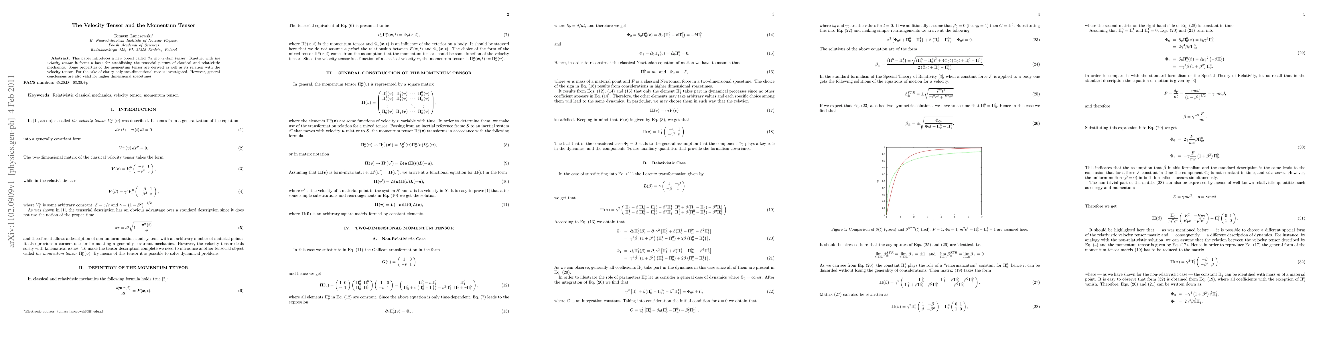 This paper introduces a new object called the momentum tensor. Together with the velocity tensor it forms a basis for establishing the tensorial picture of classical and relativistic mechanics. Some properties of the momentum tensor are derived as well as its relation with the velocity tensor. For the sake of clarity only two-dimensional case is investigated. However, general conclusions are also valid for higher dimensional spacetimes.