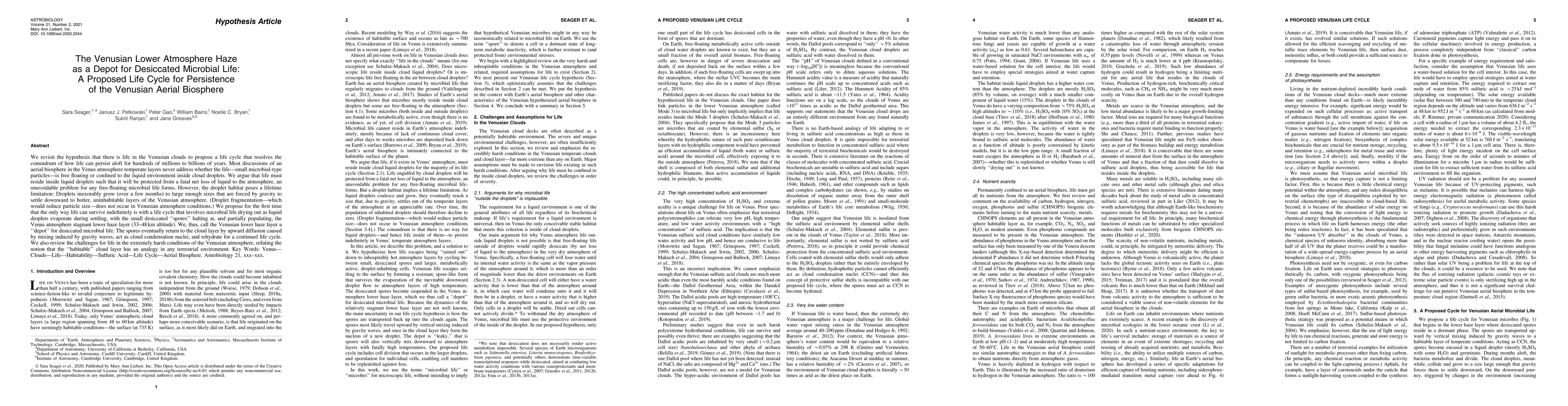 This paper proposes a life cycle for microbial life in Venus's atmosphere, suggesting that desiccated spores survive in the lower haze layer and rehydrate to continue their cycle when they return to the cloud layer, addressing the challenge of life persistence in Venus's harsh conditions.