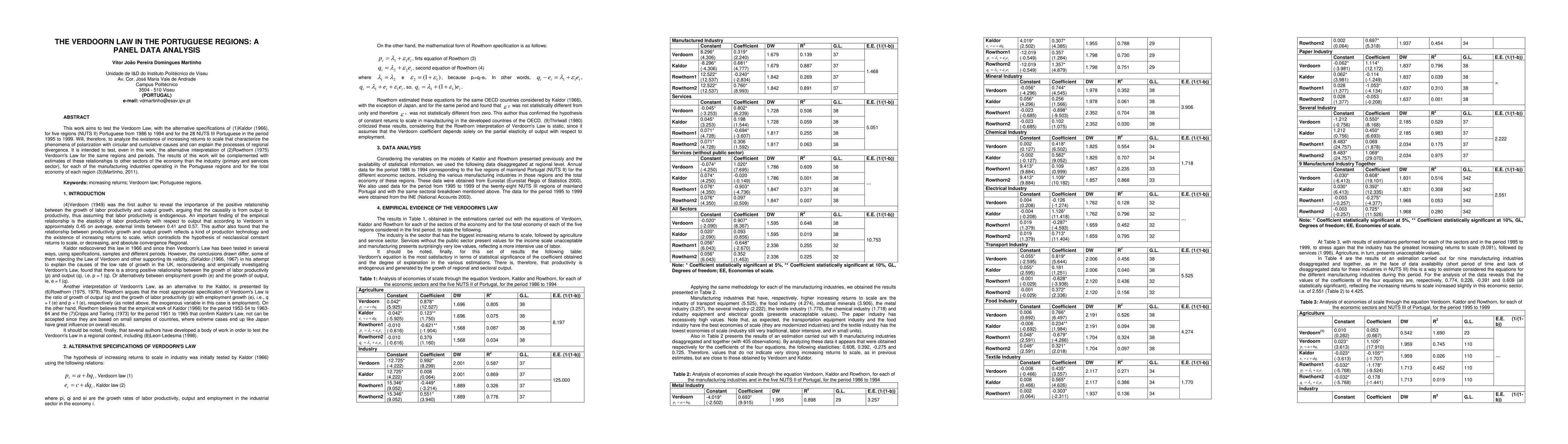 This work aims to test the Verdoorn Law, with the alternative specifications of (1)Kaldor (1966), for five regions (NUTS II) Portuguese from 1986 to 1994 and for the 28 NUTS III Portuguese in the period 1995 to 1999. Will, therefore, to analyze the existence of increasing returns to scale that characterize the phenomena of polarization with circular and cumulative causes and can explain the processes of regional divergence. It is intended to test, even in this work, the alternative interpretation of (2)Rowthorn (1975) Verdoorn's Law for the same regions and periods. The results of this work will be complemented with estimates of these relationships to other sectors of the economy than the industry (primary and services sector), for each of the manufacturing industries operating in the Portuguese regions and for the total economy of each region (3)(Martinho, 2011).