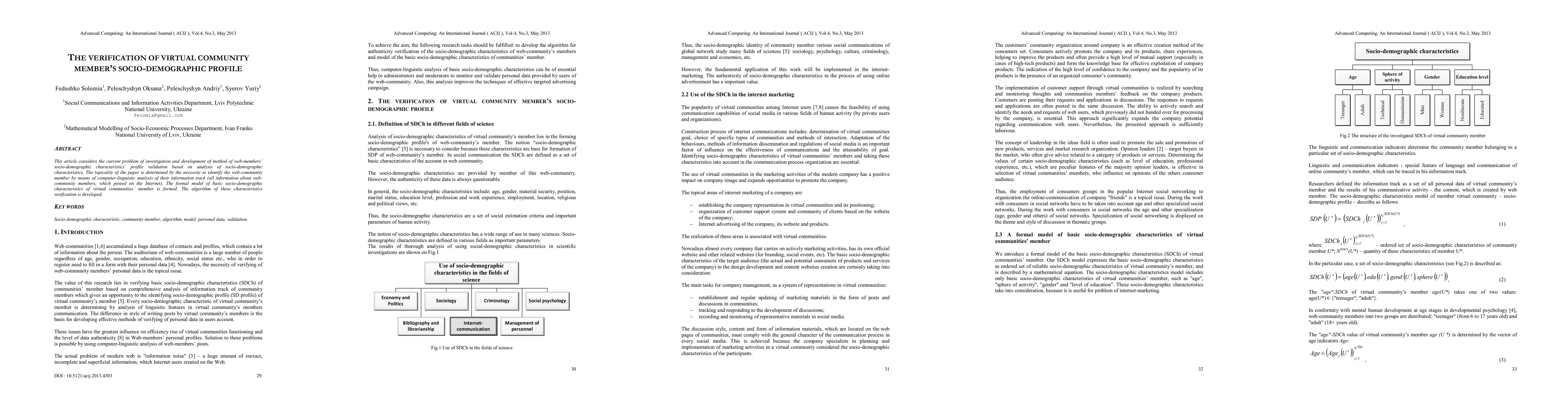 This paper develops a method for validating the socio-demographic profiles of virtual community members through computer-linguistic analysis of their online information. An algorithm is proposed for verifying these characteristics, addressing the need for accurate identification within web communities.