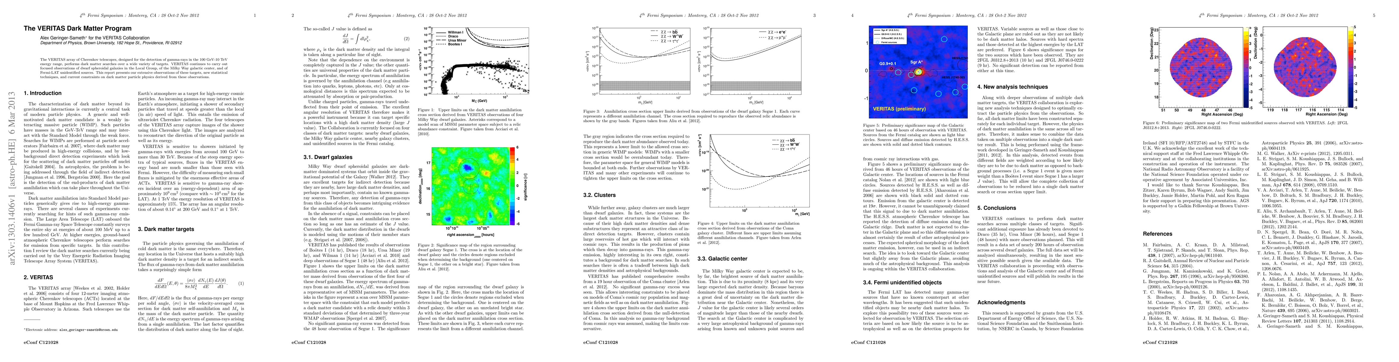 The VERITAS array of Cherenkov telescopes, designed for the detection of gamma-rays in the 100 GeV-10 TeV energy range, performs dark matter searches over a wide variety of targets. VERITAS continues to carry out focused observations of dwarf spheroidal galaxies in the Local Group, of the Milky Way galactic center, and of Fermi-LAT unidentified sources. This report presents our extensive observations of these targets, new statistical techniques, and current constraints on dark matter particle physics derived from these observations.