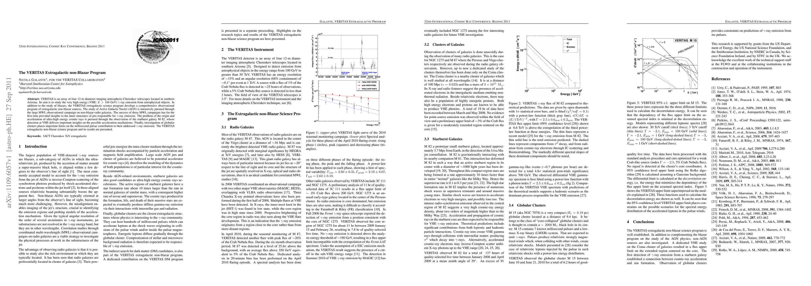 The VERITAS array studies very high energy gamma-ray emissions from extragalactic non-blazar sources, including AGN and starburst galaxies, providing insights into jet structures and cosmic ray acceleration mechanisms. The program also investigates globular clusters to assess millisecond pulsar contributions to gamma-ray emissions.