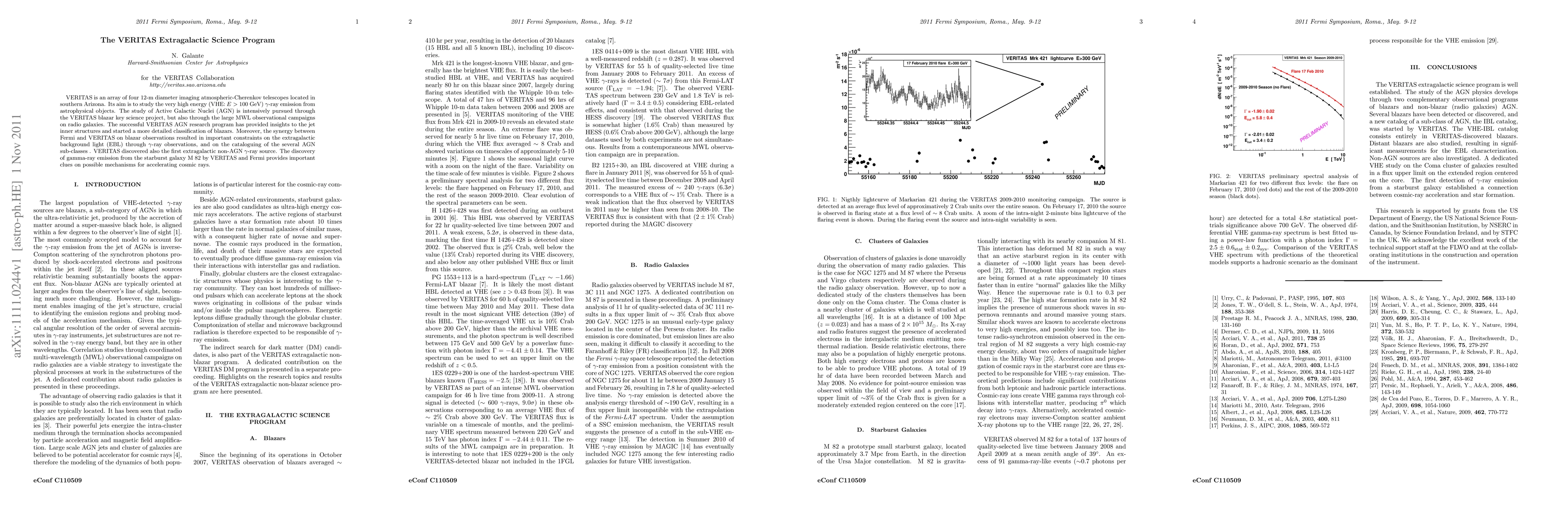 VERITAS is an array of four 12-m diameter imaging atmospheric-Cherenkov telescopes located in southern Arizona. Its aim is to study the very high energy (VHE: E > 100 GeV) gamma-ray emission from astrophysical objects. The study of Active Galactic Nuclei (AGN) is intensively pursued through the VERITAS blazar key science project, but also through the large MWL observational campaigns on radio galaxies. The successful VERITAS AGN research program has provided insights to the jet inner structures and started a more detailed classification of blazars. Moreover, the synergy between Fermi and VERITAS on blazar observations resulted in important constraints on the extragalactic background light (EBL) through gamma-ray observations, and on the cataloguing of the several AGN sub-classes . VERITAS discovered also the first extragalactic non-AGN gamma-ray source. The discovery of gamma-ray emission from the starburst galaxy M 82 by VERITAS and Fermi provides important clues on possible mechanisms for accelerating cosmic rays.
