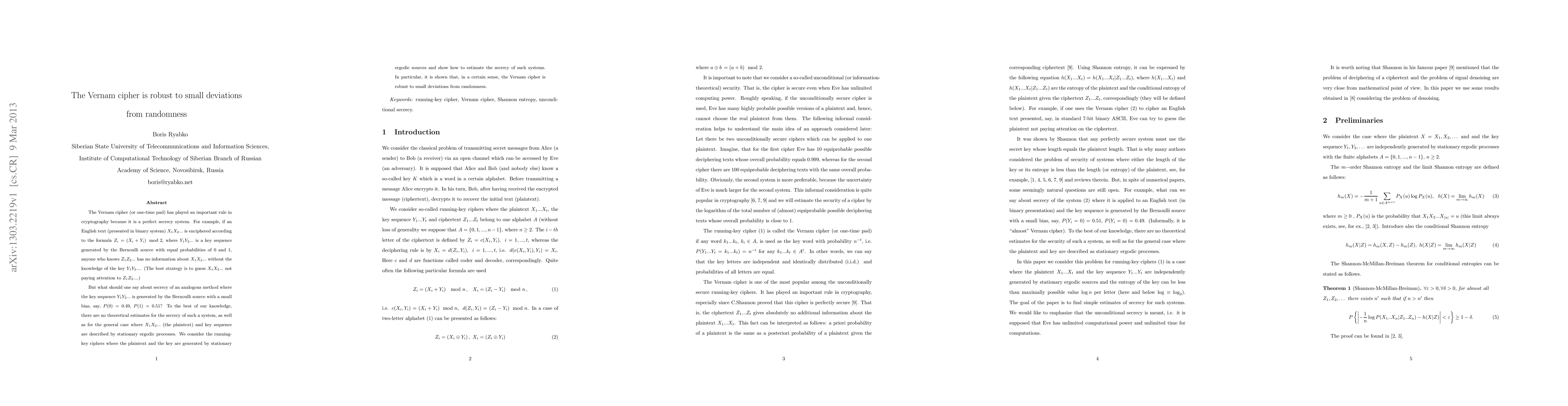 This paper investigates the robustness of the Vernam cipher (one-time pad) when the key sequence has a small bias, demonstrating that the cipher remains secure even with minor deviations from perfect randomness. It provides theoretical estimates for the secrecy of running-key ciphers where both plaintext and key are generated by stationary ergodic processes.