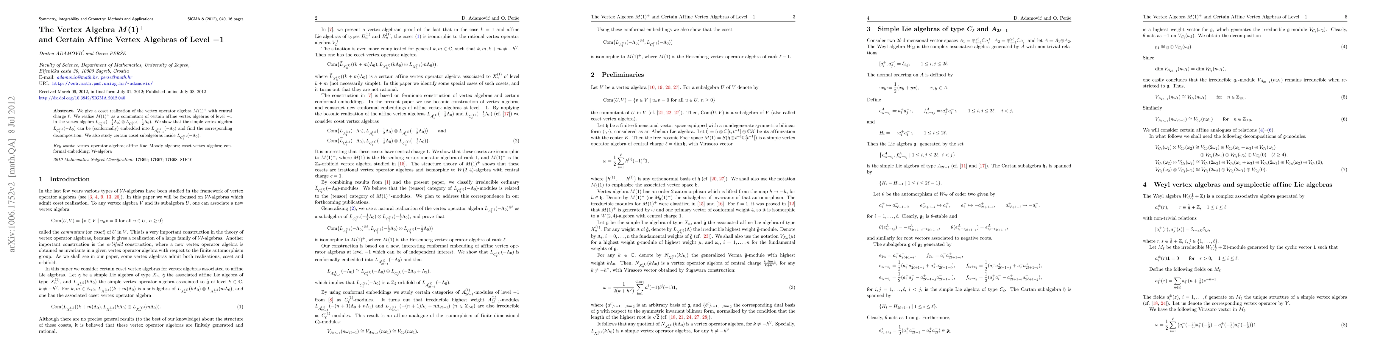 This research paper establishes a coset realization of the vertex operator algebra $M(1)^+$ with central charge $ au$, linking it to affine vertex algebras of level -1 and exploring its embedding into other vertex algebras.