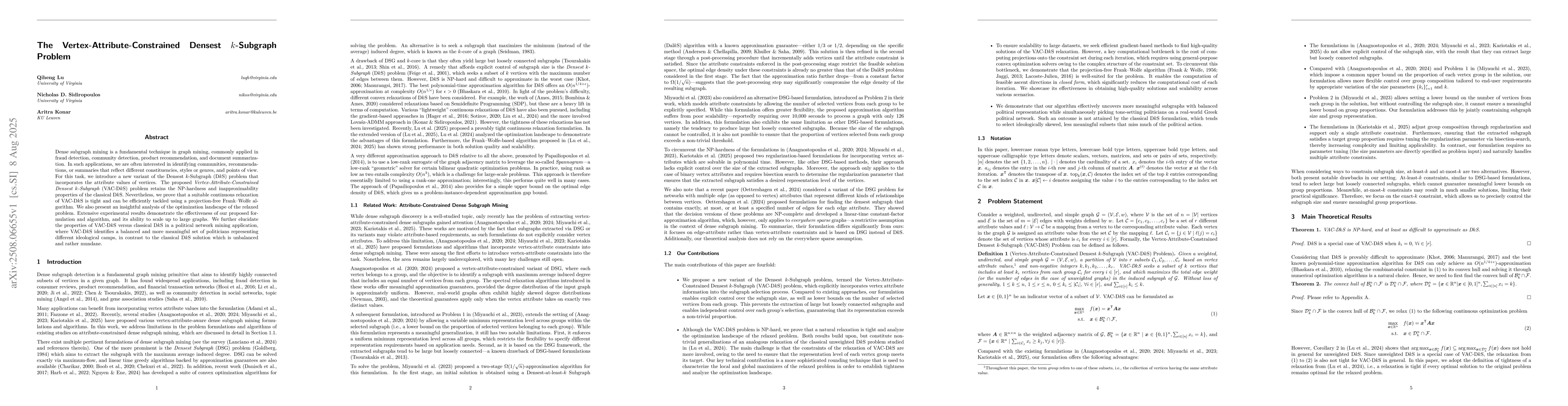 Dense subgraph mining is a fundamental technique in graph mining, commonly applied in fraud detection, community detection, product recommendation, and document summarization. In such applications, we are often interested in identifying communities, recommendations, or summaries that reflect different constituencies, styles or genres, and points of view. For this task, we introduce a new variant of the Densest $k$-Subgraph (D$k$S) problem that incorporates the attribute values of vertices. The proposed Vertex-Attribute-Constrained Densest $k$-Subgraph (VAC-D$k$S) problem retains the NP-hardness and inapproximability properties of the classical D$k$S. Nevertheless, we prove that a suitable continuous relaxation of VAC-D$k$S is tight and can be efficiently tackled using a projection-free Frank--Wolfe algorithm. We also present an insightful analysis of the optimization landscape of the relaxed problem. Extensive experimental results demonstrate the effectiveness of our proposed formulation and algorithm, and its ability to scale up to large graphs. We further elucidate the properties of VAC-D$k$S versus classical D$k$S in a political network mining application, where VAC-D$k$S identifies a balanced and more meaningful set of politicians representing different ideological camps, in contrast to the classical D$k$S solution which is unbalanced and rather mundane.