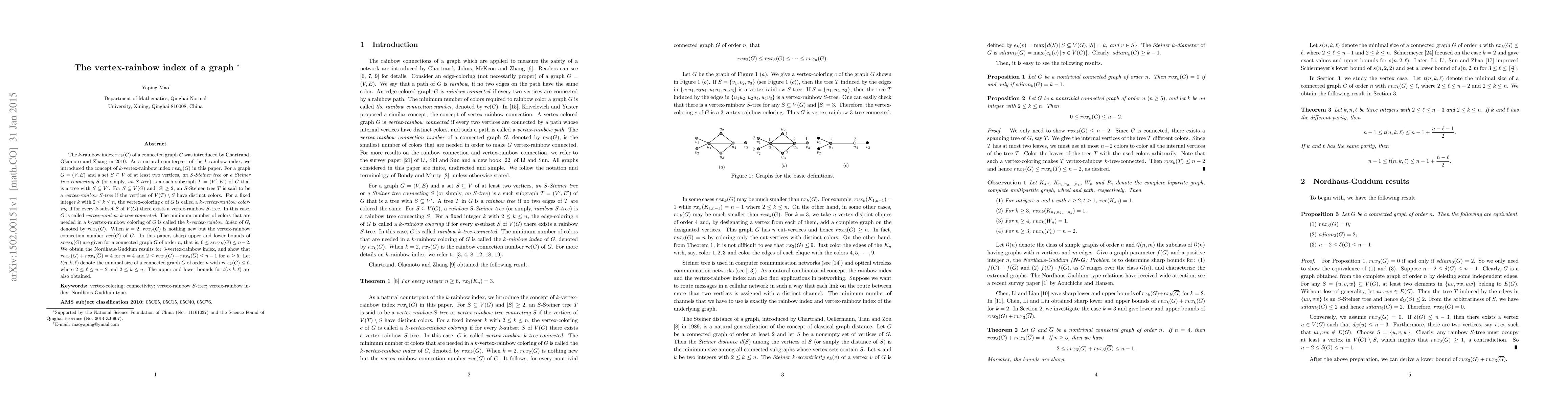 The $k$-rainbow index $rx_k(G)$ of a connected graph $G$ was introduced by Chartrand, Okamoto and Zhang in 2010. As a natural counterpart of the $k$-rainbow index, we introduced the concept of $k$-vertex-rainbow index $rvx_k(G)$ in this paper. For a graph $G=(V,E)$ and a set $S\subseteq V$ of at least two vertices, \emph{an $S$-Steiner tree} or \emph{a Steiner tree connecting $S$} (or simply, \emph{an $S$-tree}) is a such subgraph $T=(V',E')$ of $G$ that is a tree with $S\subseteq V'$. For $S\subseteq V(G)$ and $|S|\geq 2$, an $S$-Steiner tree $T$ is said to be a \emph{vertex-rainbow $S$-tree} if the vertices of $V(T)\setminus S$ have distinct colors. For a fixed integer $k$ with $2\leq k\leq n$, the vertex-coloring $c$ of $G$ is called a \emph{$k$-vertex-rainbow coloring} if for every $k$-subset $S$ of $V(G)$ there exists a vertex-rainbow $S$-tree. In this case, $G$ is called \emph{vertex-rainbow $k$-tree-connected}. The minimum number of colors that are needed in a $k$-vertex-rainbow coloring of $G$ is called the \emph{$k$-vertex-rainbow index} of $G$, denoted by $rvx_k(G)$. When $k=2$, $rvx_2(G)$ is nothing new but the vertex-rainbow connection number $rvc(G)$ of $G$. In this paper, sharp upper and lower bounds of $srvx_k(G)$ are given for a connected graph $G$ of order $n$,\ that is, $0\leq srvx_k(G)\leq n-2$. We obtain the Nordhaus-Guddum results for $3$-vertex-rainbow index, and show that $rvx_3(G)+rvx_3(\overline{G})=4$ for $n=4$ and $2\leq rvx_3(G)+rvx_3(\overline{G})\leq n-1$ for $n\geq 5$. Let $t(n,k,\ell)$ denote the minimal size of a connected graph $G$ of order $n$ with $rvx_k(G)\leq \ell$, where $2\leq \ell\leq n-2$ and $2\leq k\leq n$. The upper and lower bounds for $t(n,k,\ell)$ are also obtained.