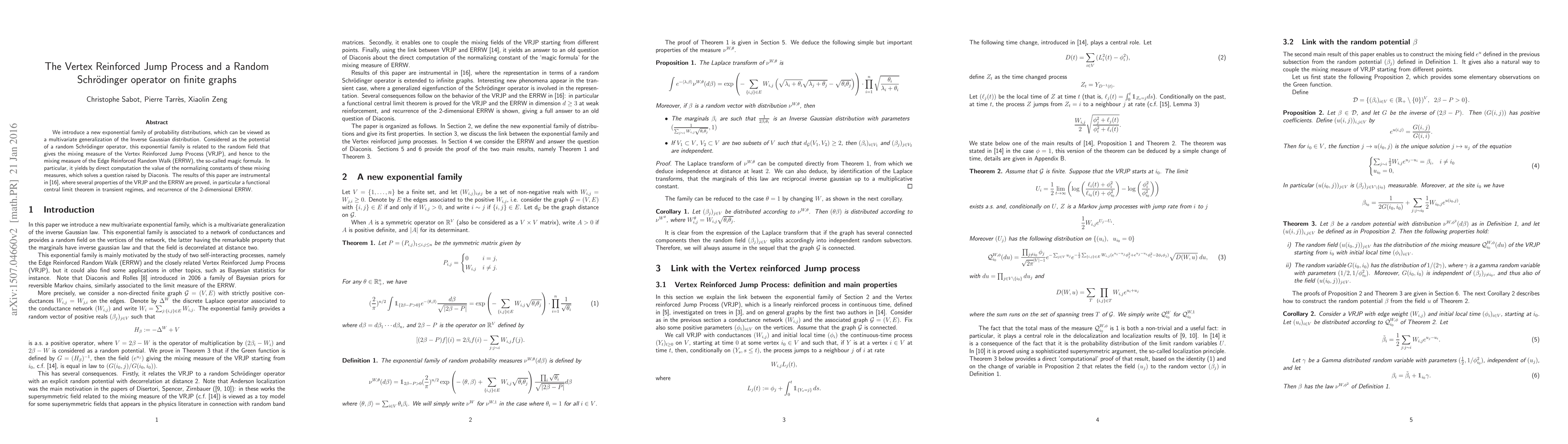 We introduce a new exponential family of probability distributions, which can be viewed as a multivariate generalization of the Inverse Gaussian distribution. Considered as the potential of a random Schr\"odinger operator, this exponential family is related to the random field that gives the mixing measure of the Vertex Reinforced Jump Process (VRJP), and hence to the mixing measure of the Edge Reinforced Random Walk (ERRW), the so-called magic formula. In particular, it yields by direct computation the value of the normalizing constants of these mixing measures, which solves a question raised by Diaconis. The results of this paper are instrumental in [Sabot-Zeng,2015], where several properties of the VRJP and the ERRW are proved, in particular a functional central limit theorem in transient regimes, and recurrence of the 2-dimensional ERRW.