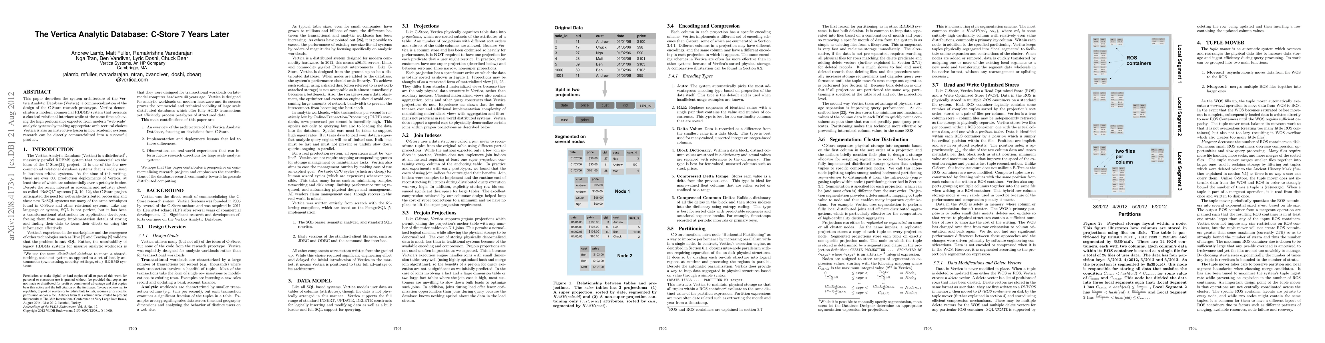 This paper outlines the architecture of Vertica, a commercial RDBMS based on the C-Store prototype, showcasing high performance for web-scale analytics while maintaining a classical relational interface. It serves as a case study in successfully translating academic research into a commercially viable product.