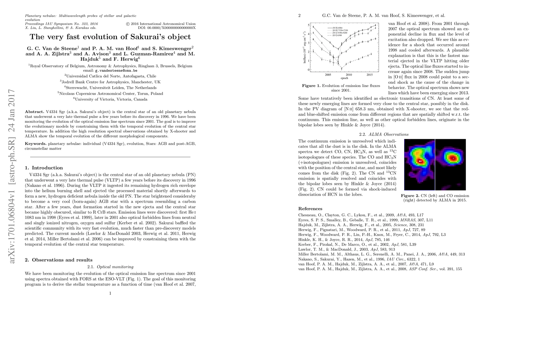 This paper monitors the rapid evolution of Sakurai's object, the central star of an old planetary nebula, focusing on its thermal pulse and spectral changes since 2001 to refine evolutionary models and analyze morphological components using high-resolution X-shooter and ALMA observations.