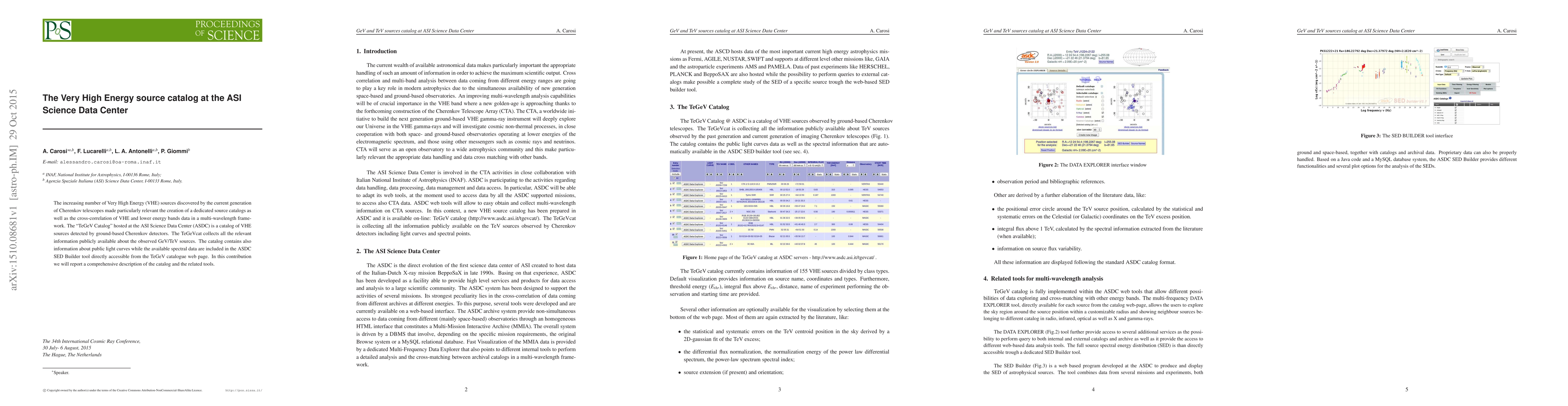 The "TeGeV Catalog" at the ASI Science Data Center compiles Very High Energy (VHE) sources detected by ground-based Cherenkov telescopes, providing comprehensive data and tools for cross-correlation with lower energy bands in a multi-wavelength framework. The catalog includes public light curves and spectral data accessible via the ASDC SED Builder tool.