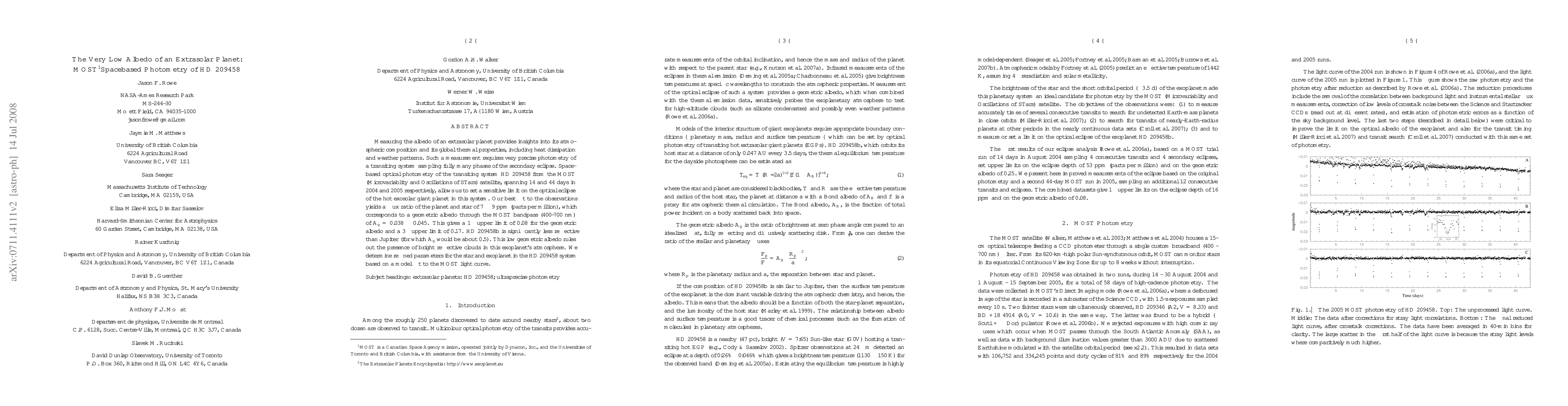The MOST satellite's space-based photometry of the transiting exoplanet HD 209458b reveals a very low geometric albedo of 0.038 ± 0.045, indicating minimal reflective cloud cover and providing insights into its atmospheric composition and thermal properties.