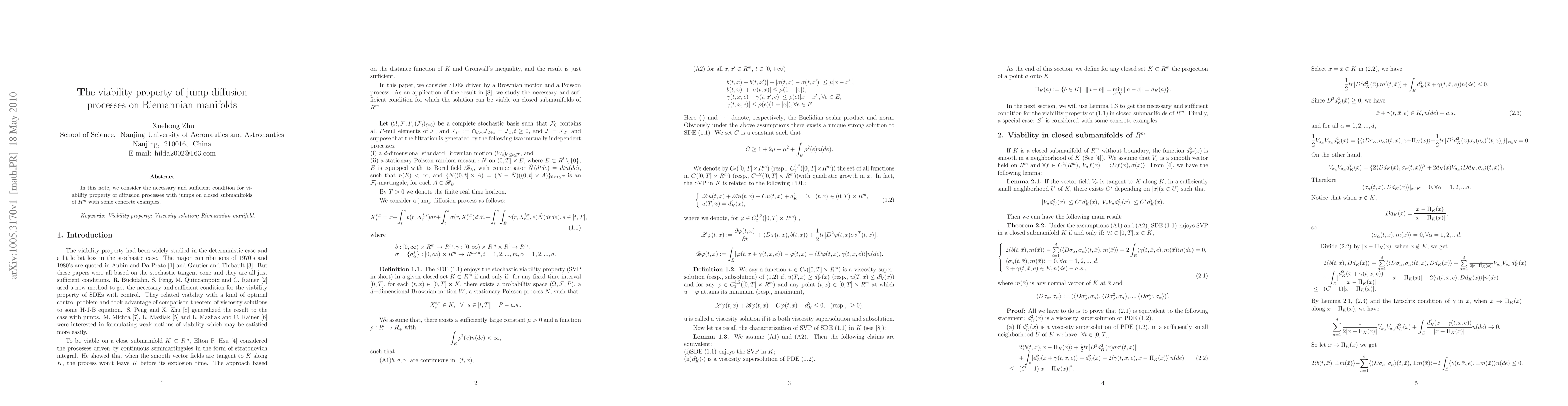 This research paper investigates the viability property of jump diffusion processes on Riemannian manifolds, providing a necessary and sufficient condition for viability on closed submanifolds in $R^{m}$. The study has implications for understanding the behavior of complex systems with jumps and discontinuities.