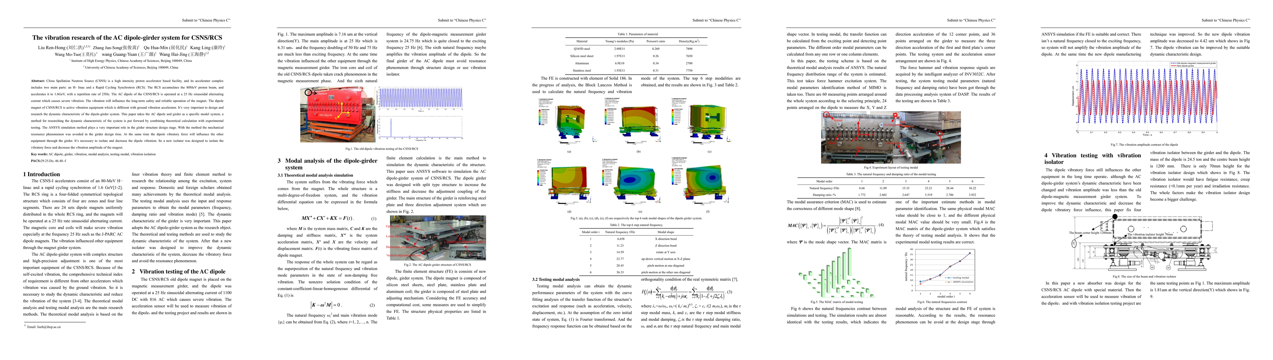 China spallation neutron source(CSNS) is a high intensity proton accelerator based facility, and its accelerator complex includes two main parts: an H- linac and a rapid cycling synchrotron(RCS). The rcs accumulates the 80MeV proton beam, and accelerates it to 1.6GeV, with a repetition rate of 25 Hz. The AC dipole of the RCS is operated at a 25Hz sinusoidal alternating current which causes severe vibration. The vibration will influence the long-term safety and reliable operation of the magnet. The dipole magnet of RCS is active vibration equipment which is different with ground vibration accelerator. It is very important to design and research the dynamic characteristic of the dipole-girder system. This paper takes the dipole and girder as a specific model system, a method for researching the dynamic characteristic of the system is put forward by combining theoretical calculation with experimental testing. The ansys simulation method plays a very important role in the girder structure design stage. With the method the mechanical resonance phenomenon was avoided in the girder design time. At the same time the dipole vibratory force will influence the other equipment through the girder. It is necessary to isolate and decrease the dipole vibration. So a new isolator was designed to isolate the vibratory force and decrease the vibration amplitude of the magnet.
