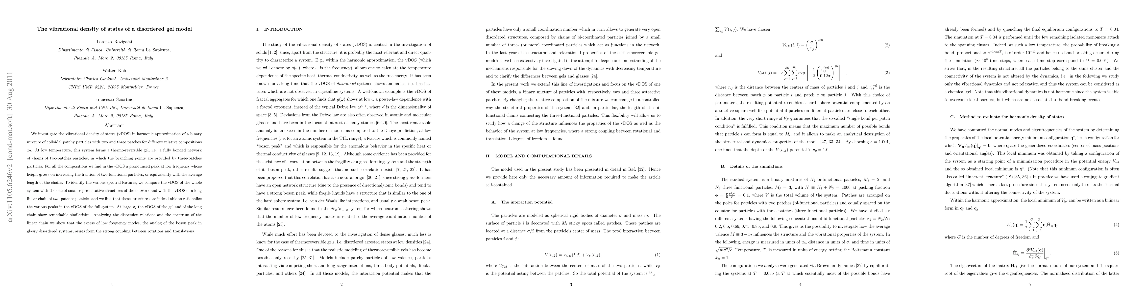 We investigate the vibrational density of states (vDOS) in harmonic approximation of a binary mixture of colloidal patchy particles with two and three patches for different relative compositions $x_2$. At low temperature, this system forms a thermo-reversible gel, i.e. a fully bonded network of chains of two-patches particles, in which the branching points are provided by three-patches particles. For all the compositions we find in the vDOS a pronounced peak at low frequency whose height grows on increasing the fraction of two-functional particles, or equivalently with the average length of the chains. To identify the various spectral features, we compare the vDOS of the whole system with the one of small representative structures of the network and with the vDOS of a long linear chain of two-patches particles and we find that these structures are indeed able to rationalize the various peaks in the vDOS of the full system. At large $x_2$ the vDOS of the gel and of the long chain show remarkable similarities. Analyzing the dispersion relations and the spectrum of the linear chain we show that the excess of low frequency modes, the analog of the boson peak in glassy disordered systems, arises from the strong coupling between rotations and translations.