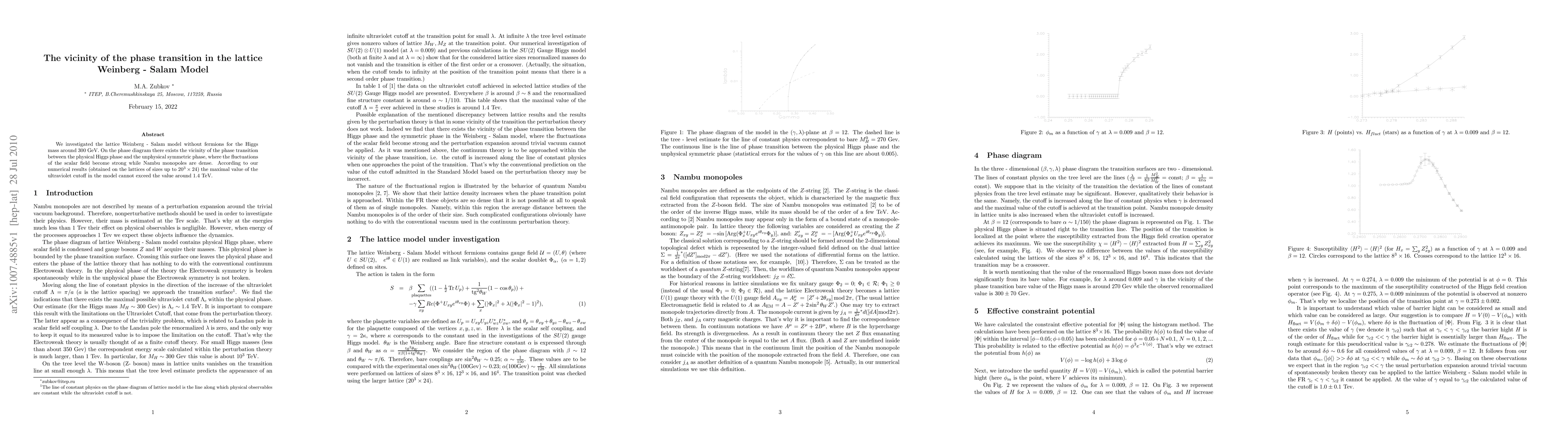 This study investigates the lattice Weinberg-Salam model near the phase transition between the physical Higgs phase and the symmetric phase, revealing strong scalar field fluctuations and dense Nambu monopoles. Numerical simulations show that the ultraviolet cutoff for the model should not exceed approximately 1.4 TeV.