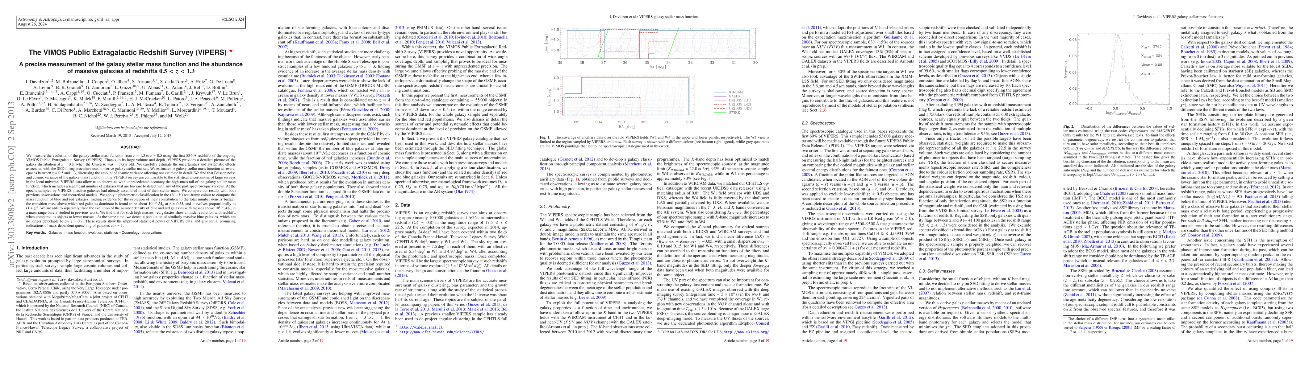 The VIPERS survey provides a precise measurement of the galaxy stellar mass function from redshifts 0.5 to 1.3, revealing the evolution of massive galaxies and their contribution to the total number density budget. The survey identifies a transition mass of about 10^10.4 M_sun where red galaxies dominate, showing a milder evolution with redshift compared to lower-mass galaxies.