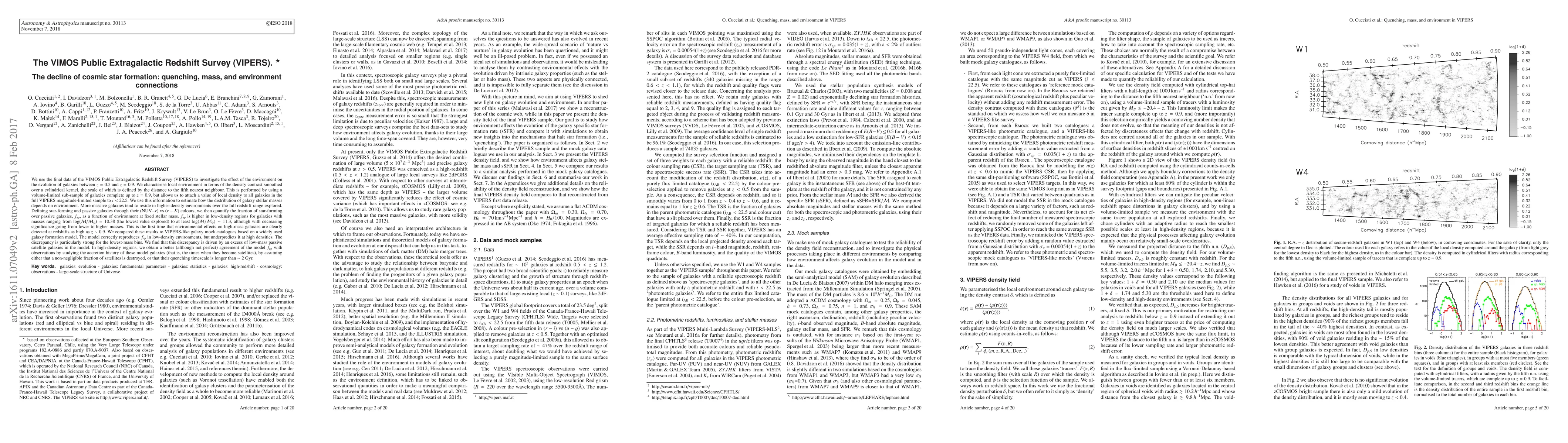 The VIMOS Public Extragalactic Redshift Survey (VIPERS) reveals that more massive galaxies predominantly reside in denser environments, and star-forming galaxies are more prevalent in low-density regions, especially for galaxies with masses up to $\log(\mathcal{M}/\mathcal{M}_\odot)\sim11.3$. The galaxy formation model of De Lucia & Blaizot underpredicts this effect in high-density environments, suggesting a need for adjustments in the quenching mechanisms of satellite galaxies.