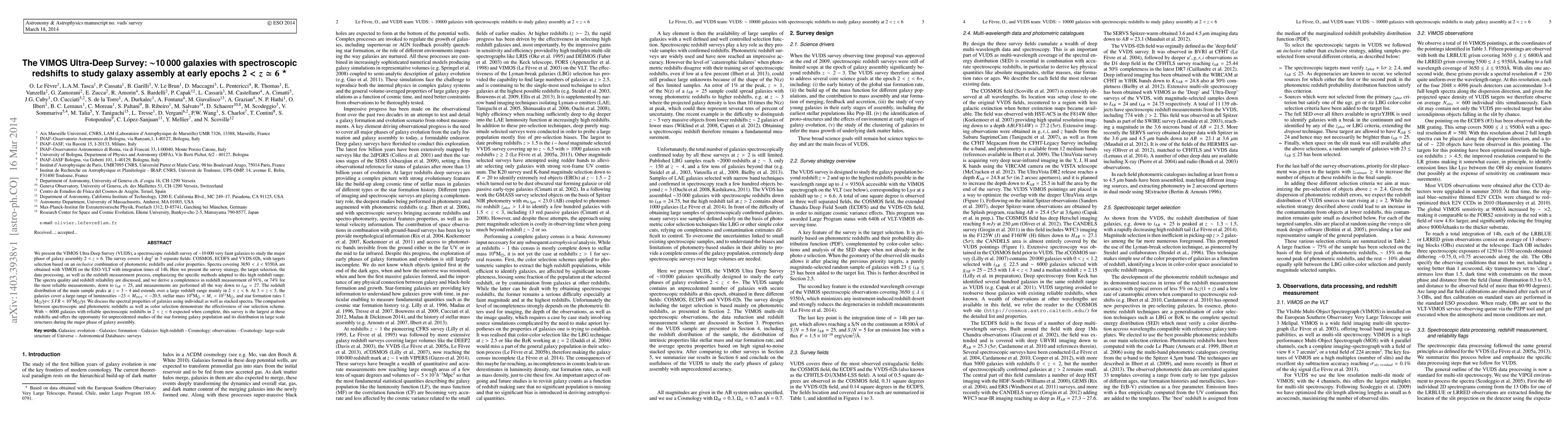 The VIMOS Ultra Deep Survey (VUDS) provides spectroscopic redshifts for ~10,000 faint galaxies to study galaxy assembly at redshifts 2<z<~6. With 91% completeness, the survey covers 1 deg^2 across three fields, revealing diverse spectral properties and large-scale structures of star-forming galaxies during their major assembly phase.