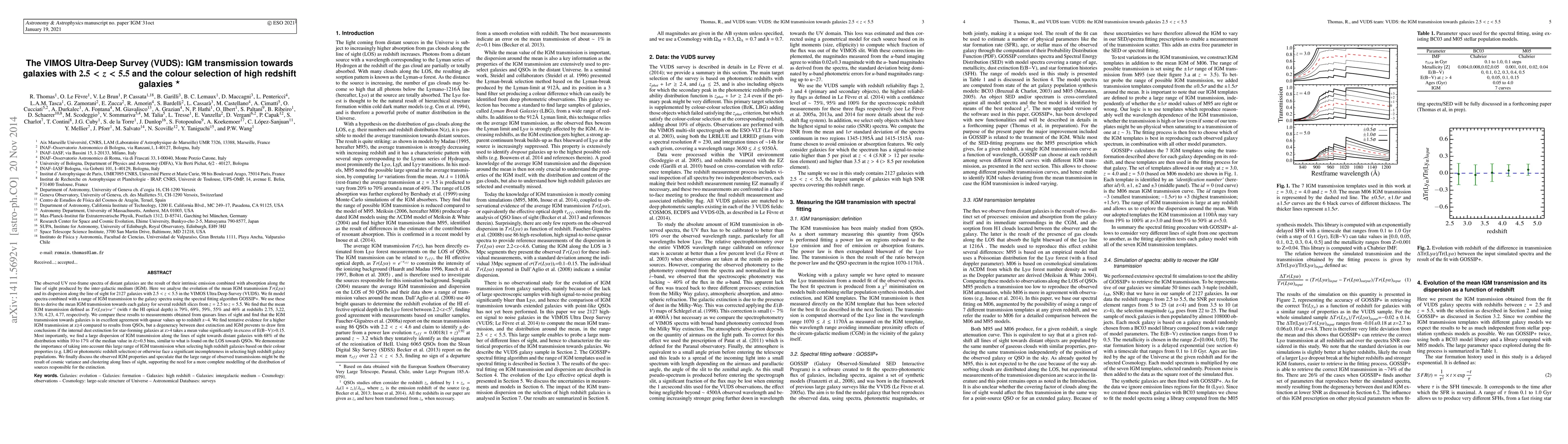 The VIMOS Ultra-Deep Survey (VUDS) investigates the mean intergalactic medium (IGM) transmission of Ly_alpha for galaxies at redshifts 2.5<z<5.5, finding decreasing transmission rates with increasing redshift. The study highlights significant dispersion in IGM transmission, emphasizing the need for considering this variability when selecting high redshift galaxies based on color criteria.