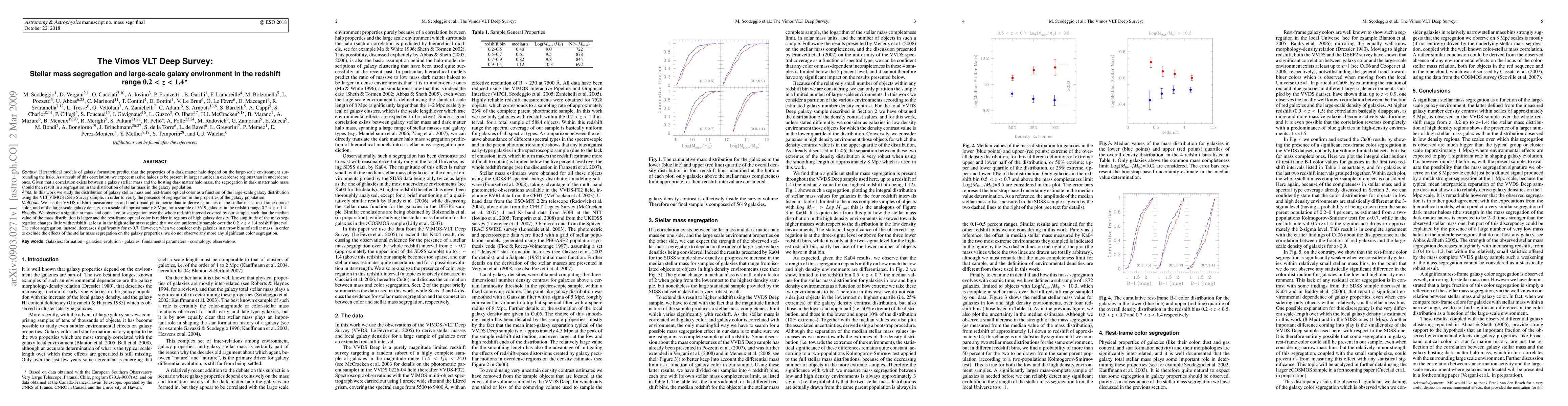 The VLT Deep Survey study found significant mass segregation of galaxies in regions with high galaxy density, with median stellar mass increasing and optical color becoming redder as density increases.