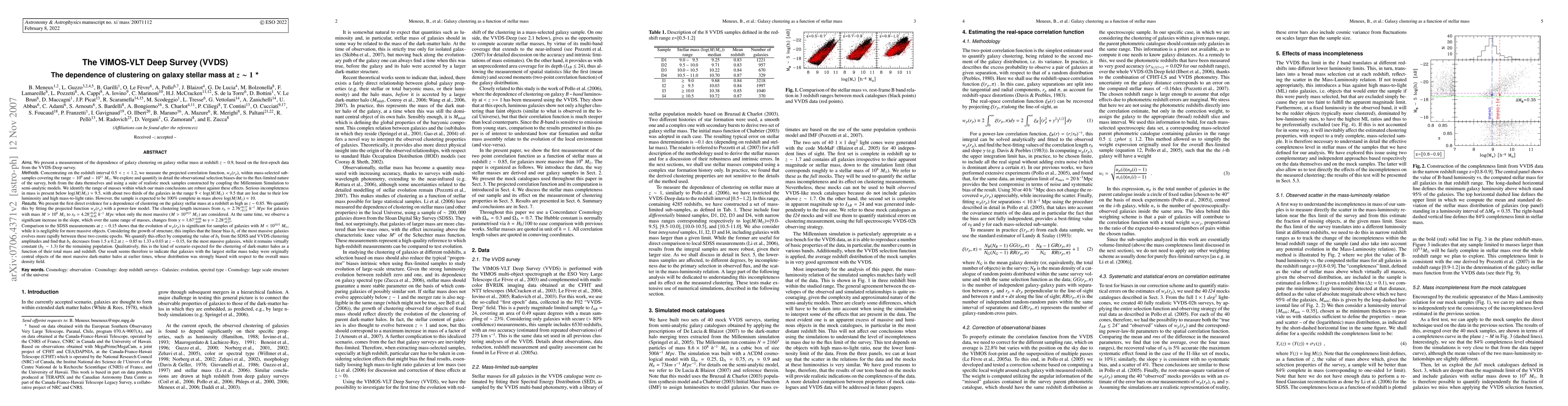 The VIMOS-VLT Deep Survey reveals a clear dependence of galaxy clustering on stellar mass at z~0.85, with the clustering length increasing from ~2.76 h^-1 Mpc for less massive galaxies to ~4.28 h^-1 Mpc for more massive ones. The study also indicates that the evolution of clustering is faster for less massive galaxies, suggesting different formation histories for mass-dependent galaxy populations.