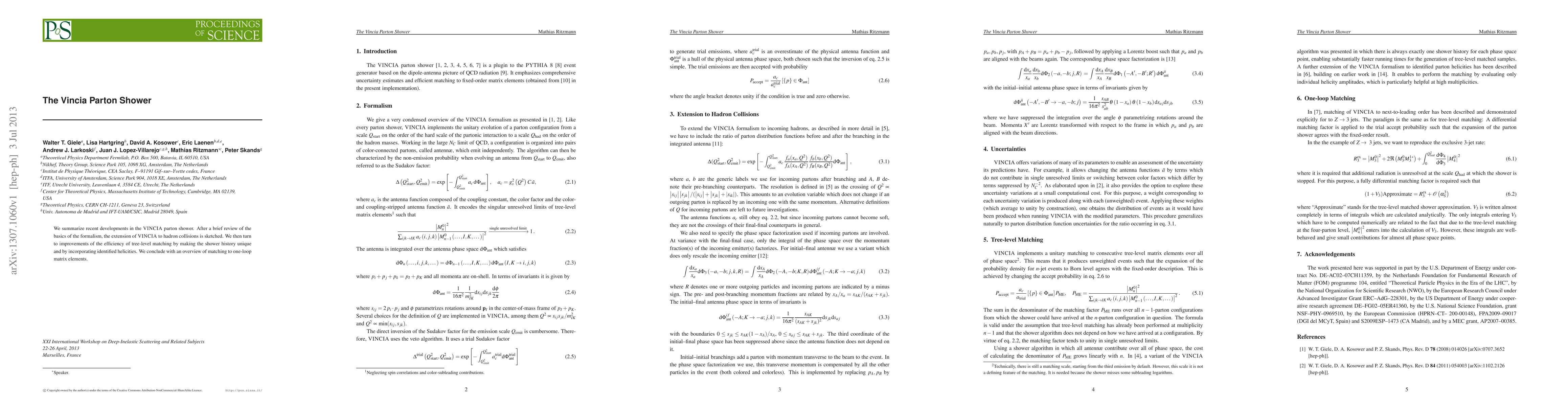 The paper discusses advancements in the VINCIA parton shower method, including its application to hadron collisions, enhancements in tree-level matching efficiency through unique shower history and identified helicities, and matching to one-loop matrix elements.